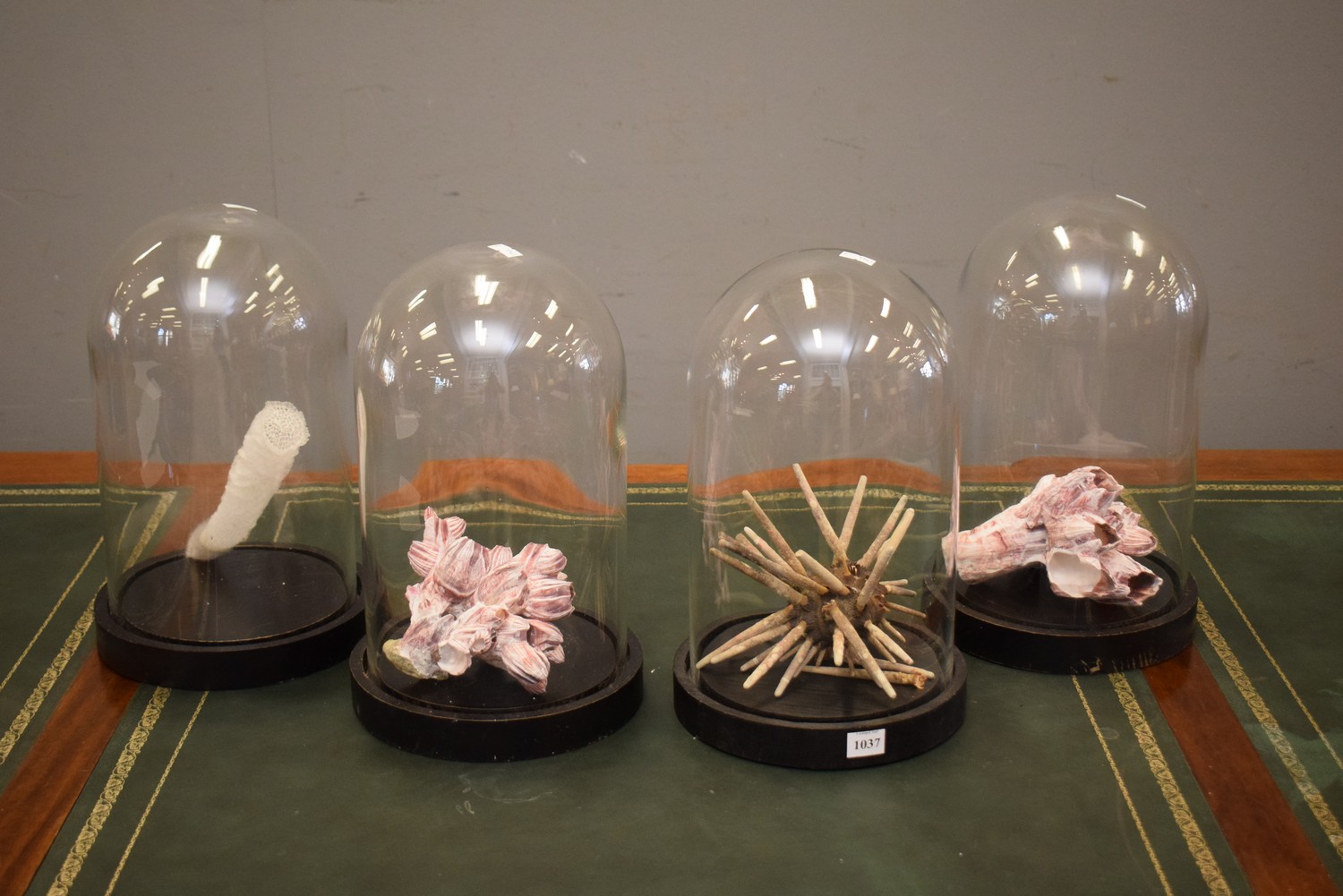 A COLLECTION OF FOUR GLASS DOMES WITH SHELL/MARINE SPECIMENS (33 CM H)