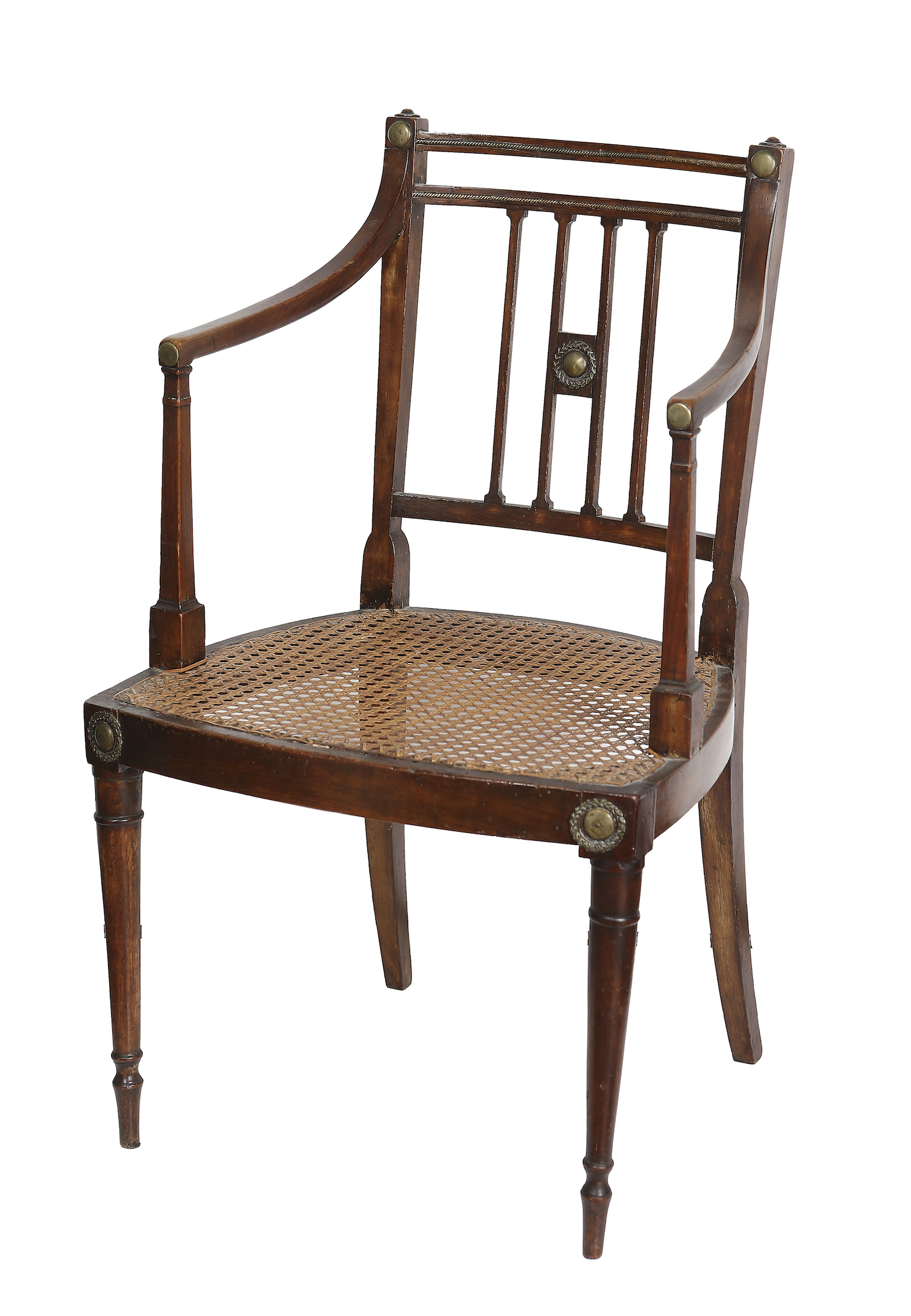 Early repair to front left leg joint. Holes from previous caning. Small chips to right of chair back. Nails to rear legs at seat rails.