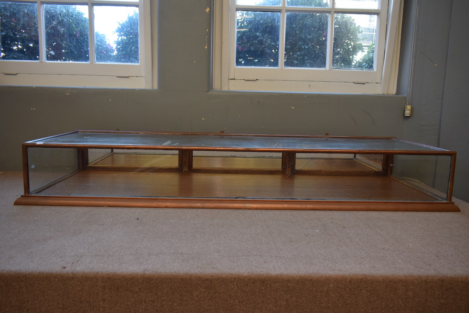 A COPPER BOUND GLASS DISPLAY TABLE TOP CABINET (26H X 171W X 61D CM)