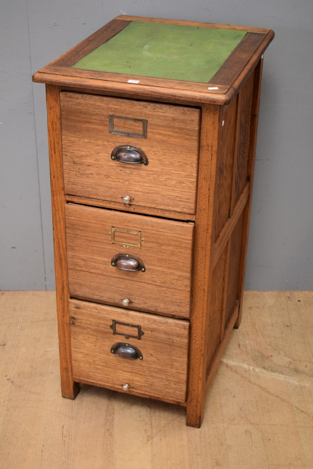 A THREE DRAWER OAK FILING CABINET (101H X 49W X 61D CM)