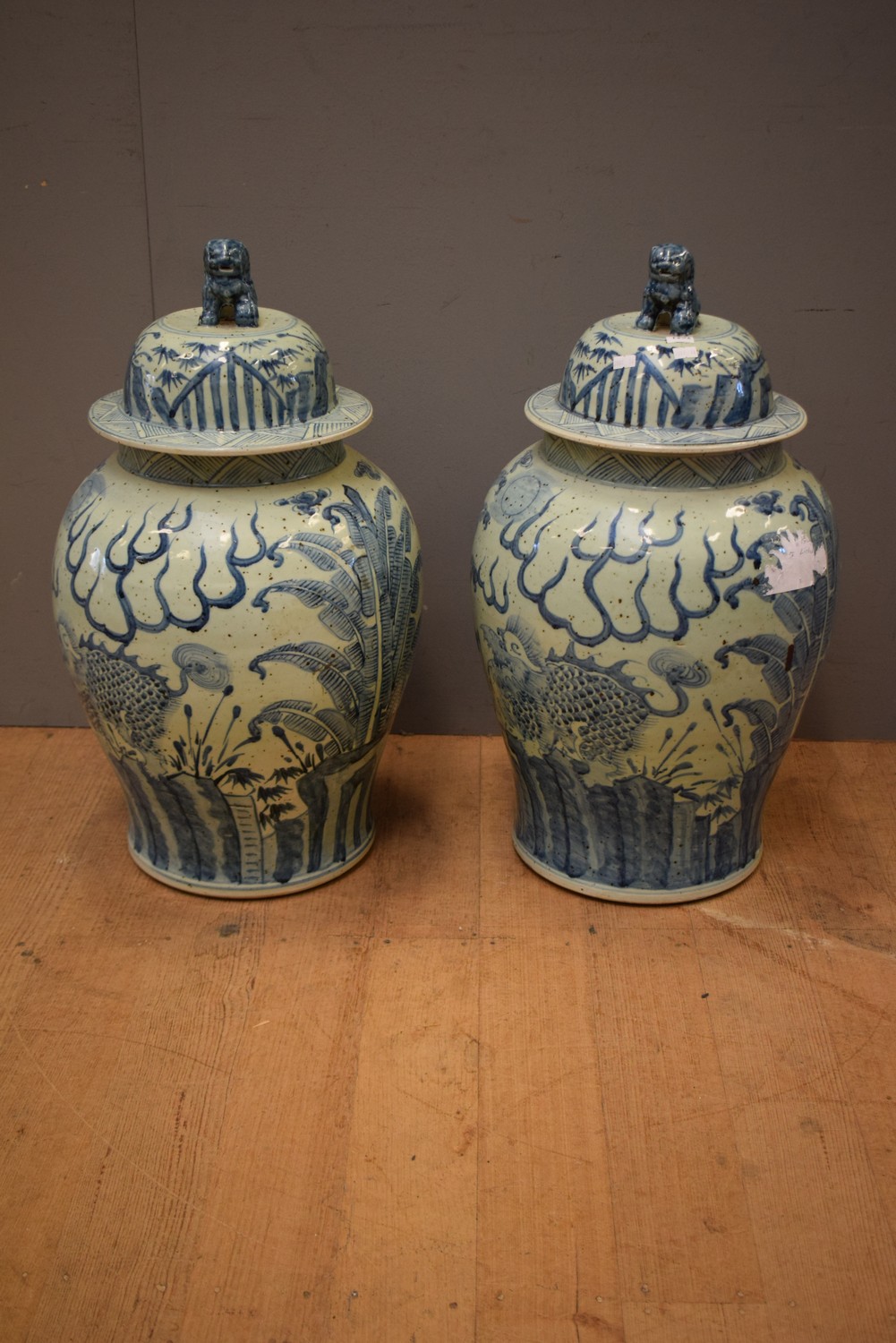 A PAIR OF 20TH CENTURY BLUE AND WHITE CHINOISERIE GINGER JARS (67 CM H)