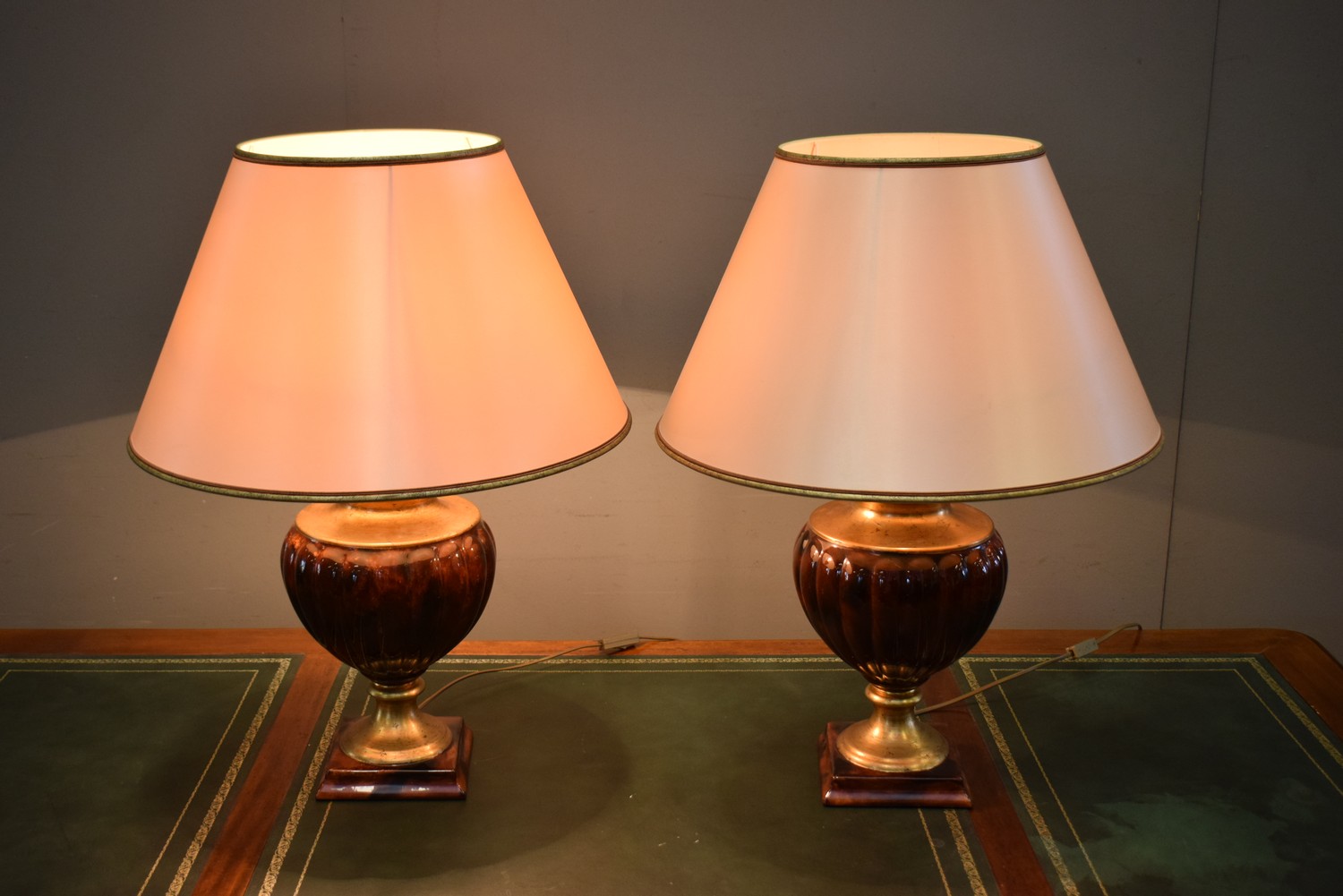 A PAIR OF FRENCH 'LE DAUPHIN' CERAMIC TABLE LAMPS WITH GILT DETAILING (69 CM H)