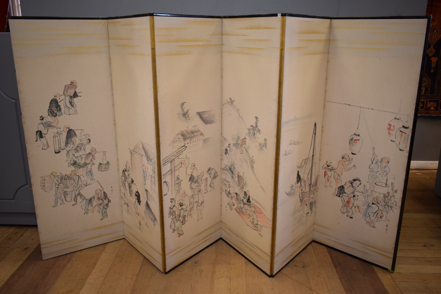 A LARGE SIX PANEL HAND PAINTED PRIVACY SCREEN (A/F) (172H X 64W EACH PANEL)