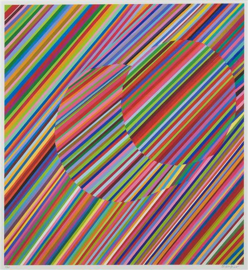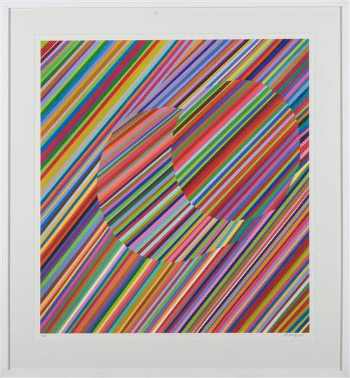 This artwork is in very good condition, no major faults to report. There is a small black mark on the upper yellow stripe (approx. the size of a pin prick), this was most likely and occurrence at the time of print. This artwork is very well framed with minor wear to edges, measuring 92 x 85cm