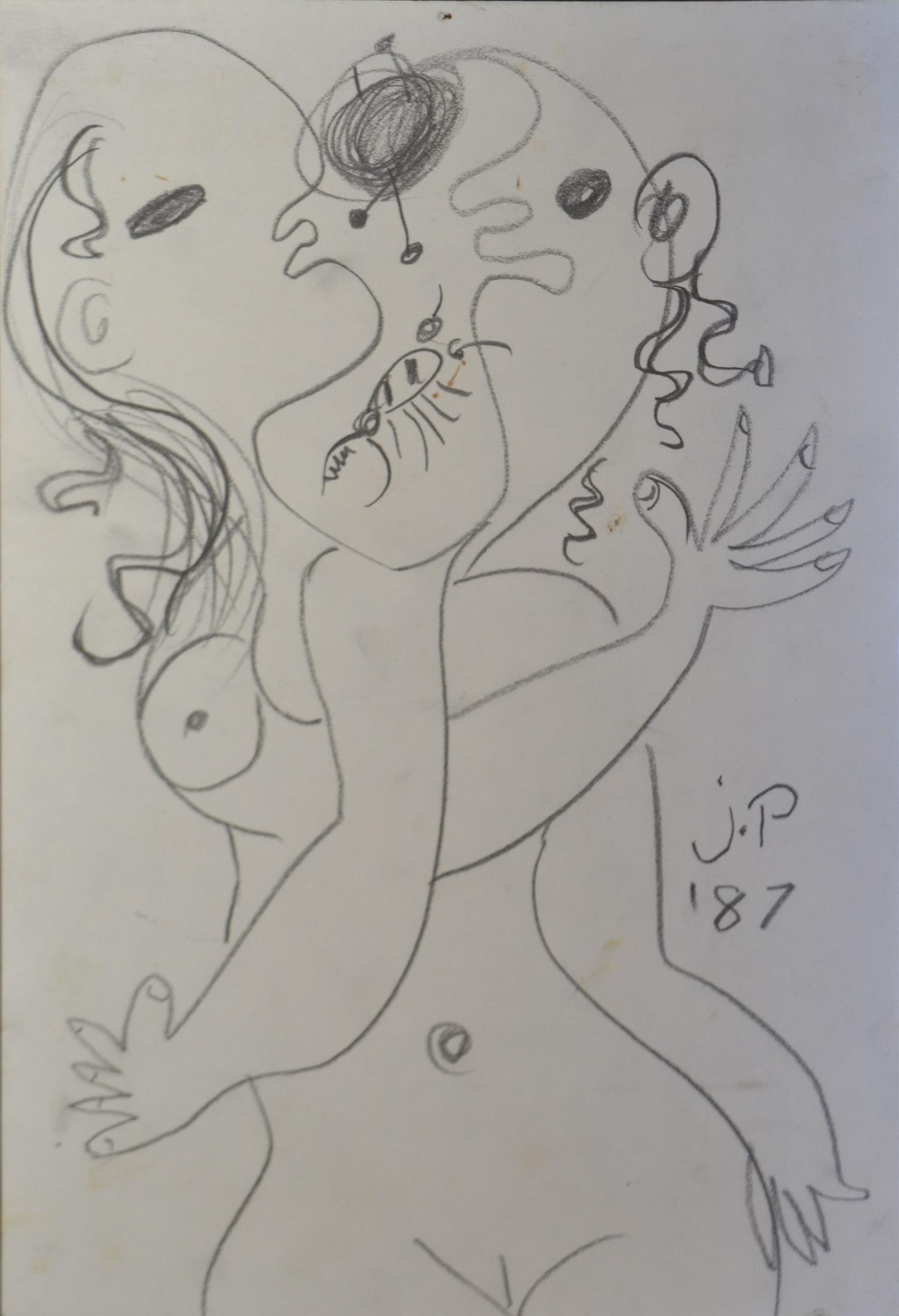 JOHN PERCEVAL, LOVERS EMBRACING 1987, PENCIL ON PAPER, 30 X 21CM, UNFRAMED, CONDITION: FOXING, DISCOLOURATION, PEN MARKS TO CORNERS AND LIGHT TEARING TO EDGES OF PAPER