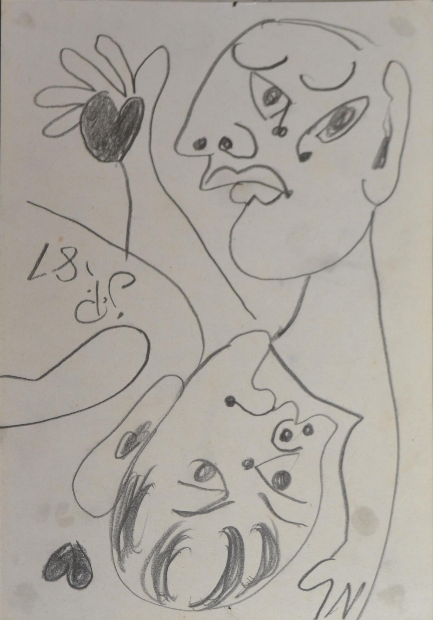 JOHN PERCEVAL, MAN IN LOVE WITH HIMSELF 1987, PENCIL ON PAPER, 25.5 X 18CM, UNFRAMED, CONDITION: FOXING, DISCOLOURATION, PEN MARKS TO CORNERS AND LIGHT TEARING TO EDGES OF PAPER