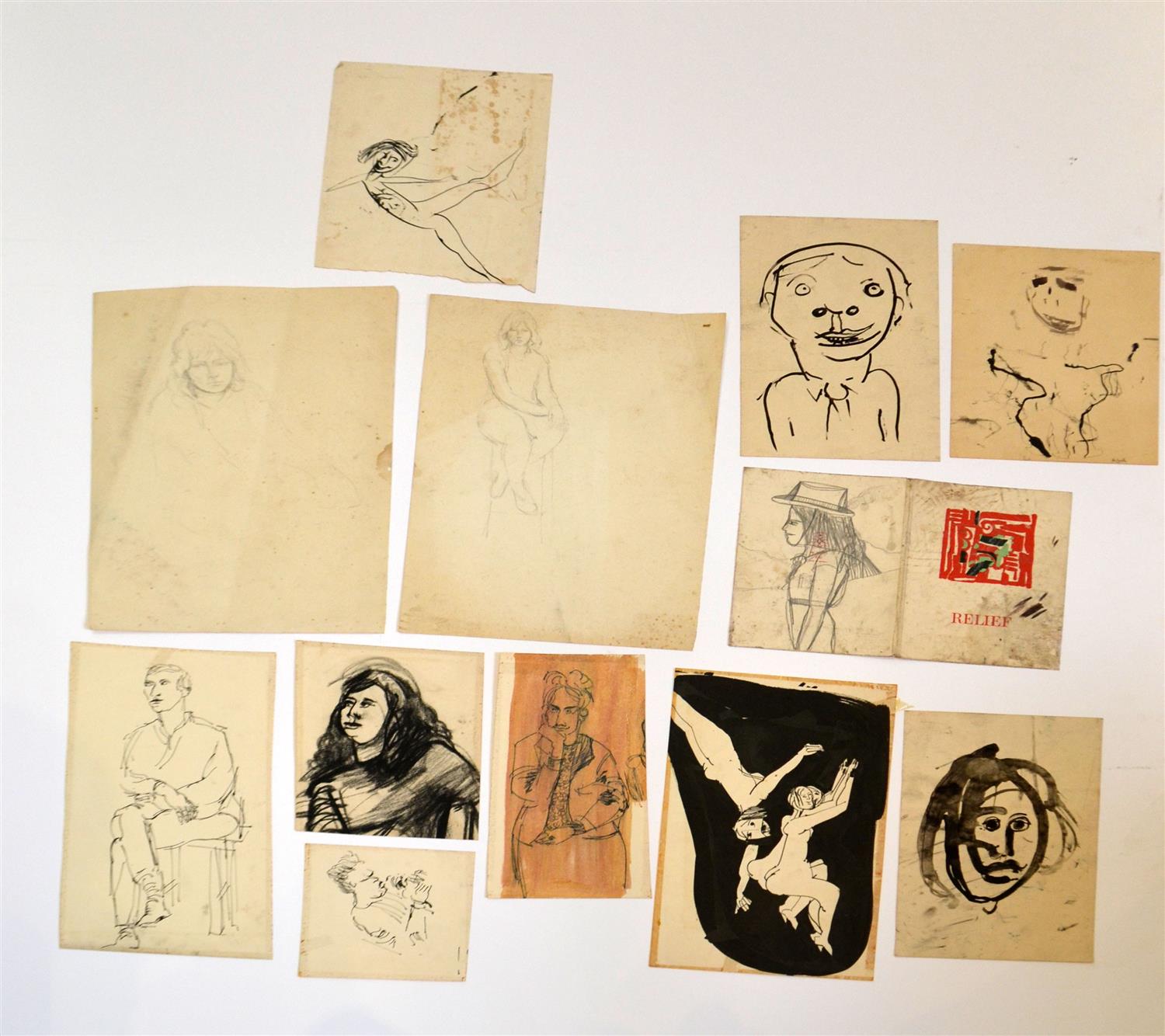 ANNE HALL, COLLECTION OF TWELVE FIGURAL SKETCHES, PENCIL ON PAPER, INK ON PAPER, SIZES VARY,