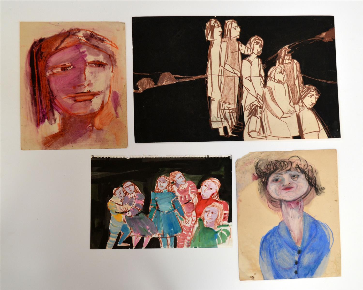 ANNE HALL, FOUR WORKS, TWO PORTRAITS AND TWO GROUP STUDIES, GOUACHE, PASTEL, MONOPRINT AND CHAROCAL ON PAPER, SIZES VARY, THREE: 39 X 27CM, ONE: 56 X 38CM,