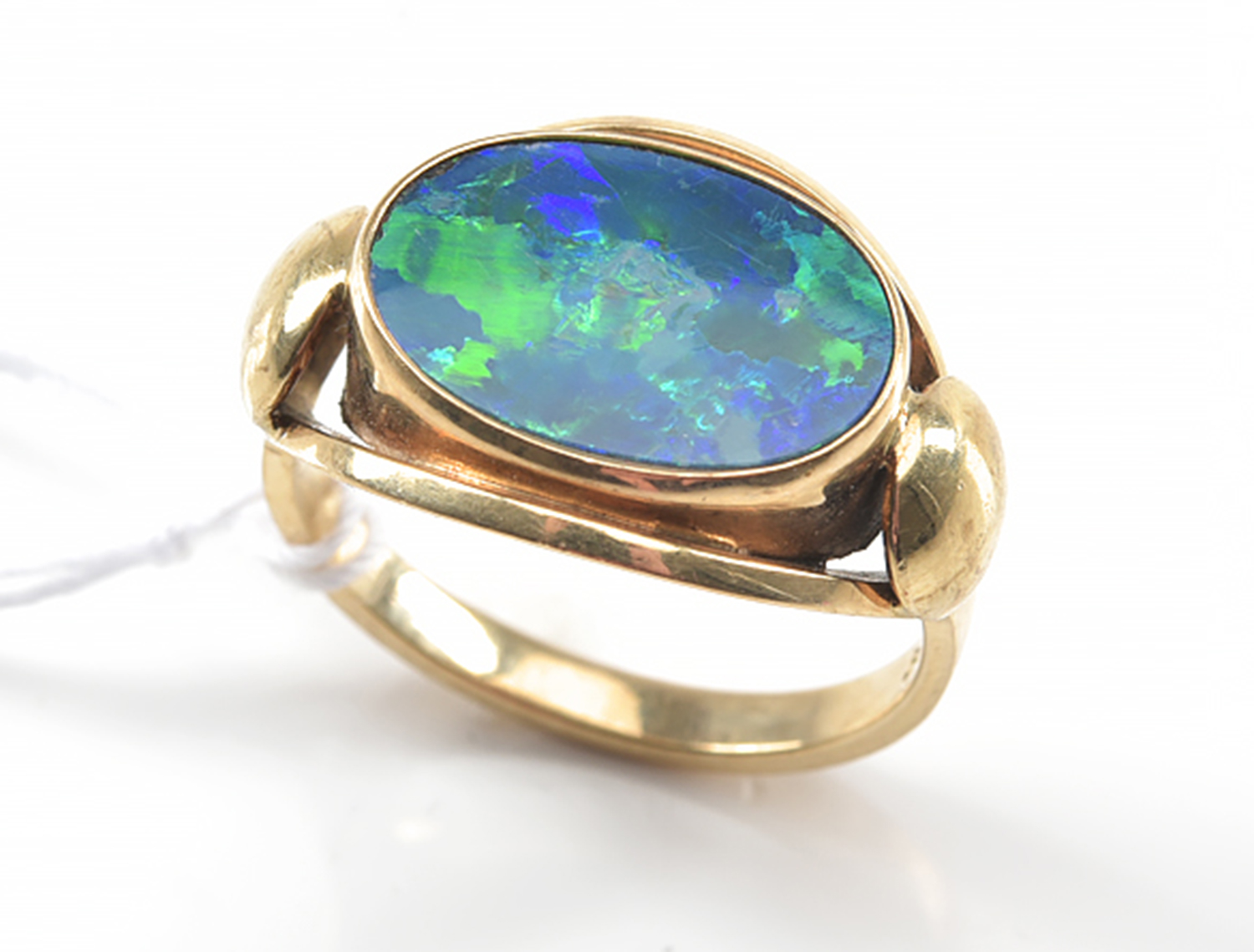 A RETRO STYLE OPAL DOUBLET RING IN 9CT GOLD, SIZE M, 3.2GMS