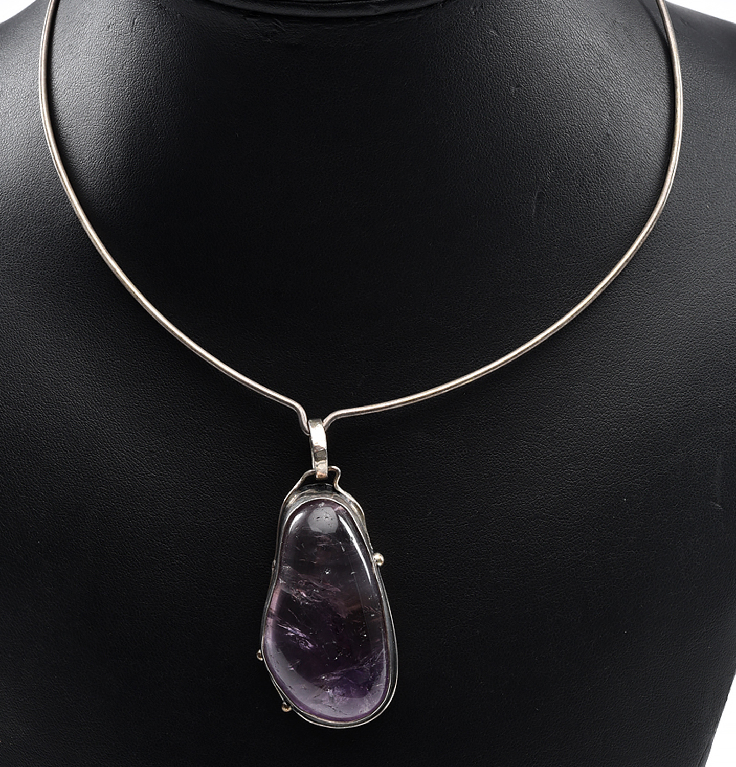 A HANDCRAFTED AMETHYST PENDANT AND COLLAR IN SILVER
