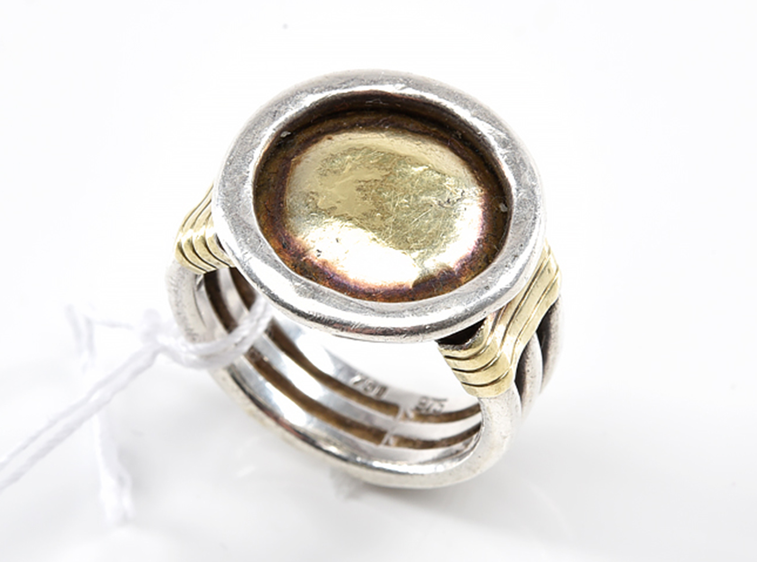 A HANDCRAFTED RING IN STERLING SILVER WITH 18CT GOLD DETAIL, UNSIGNED, SIZE M-N
