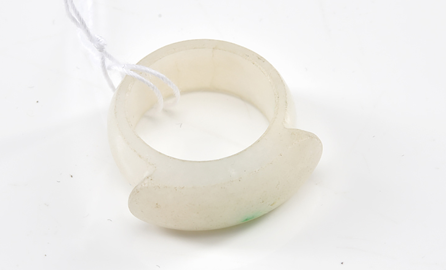 A CARVED JADE BAND IN WHITE AND GREEN TONES, SIZE N, BOXED