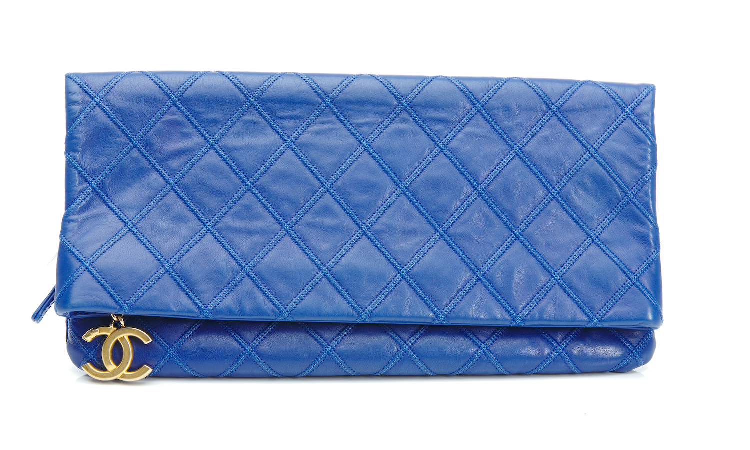 Styled in blue quilted leather with gold metal hardware, 33 x 18cm.