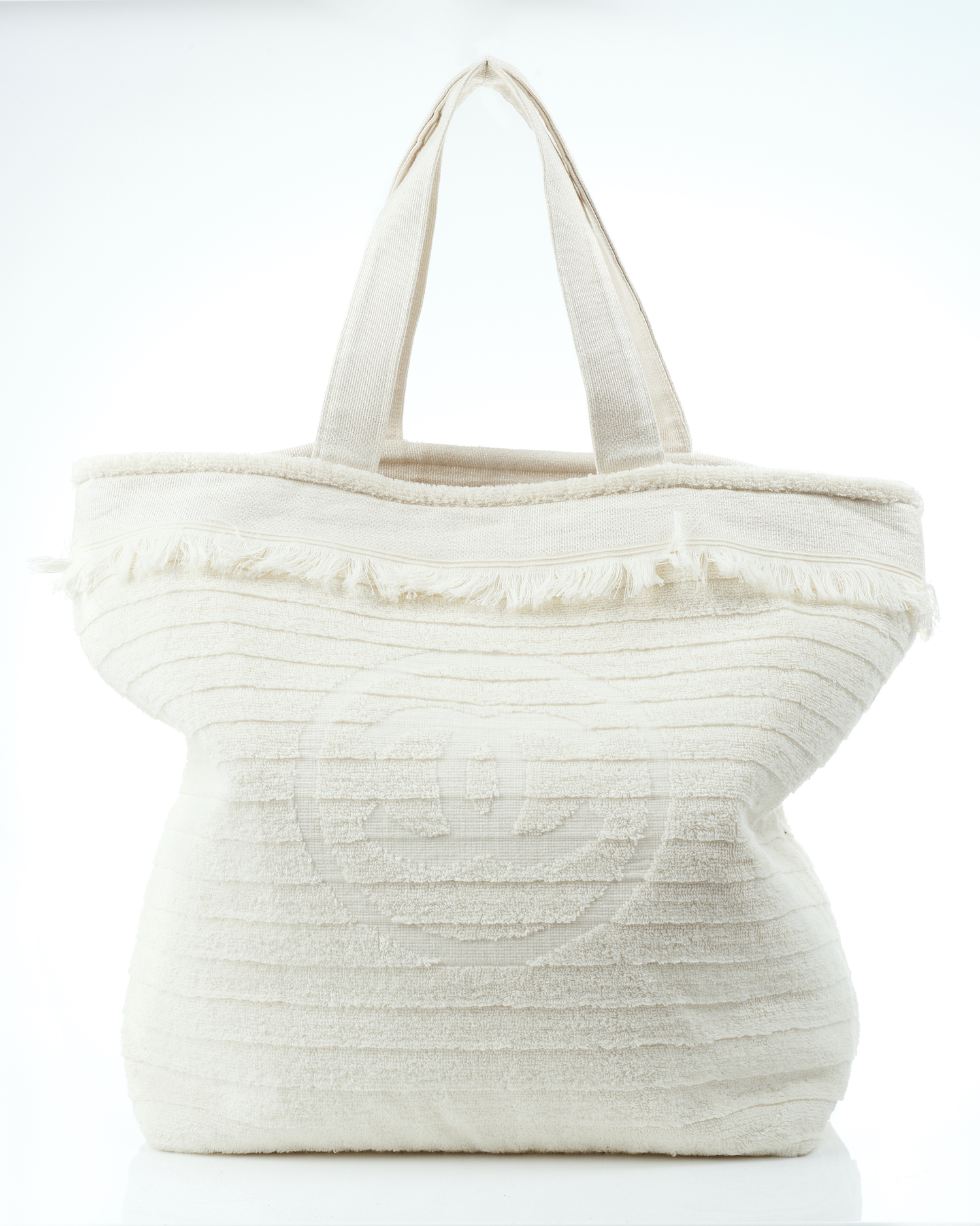 Styled in a cream cotton blend toweling with fringe and metallic grosgrain detail and handles, 35 x 45 x 20cm.