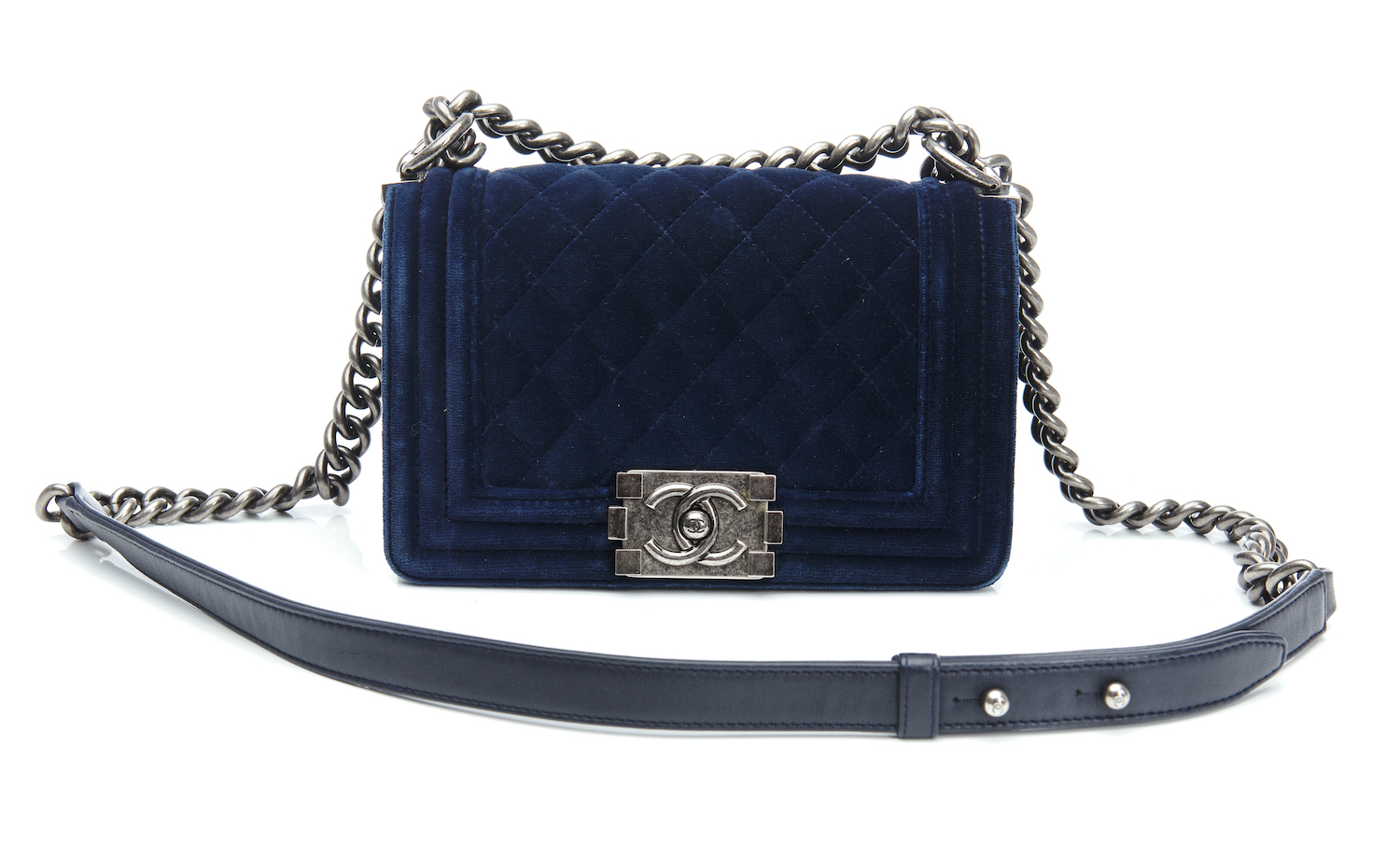 Styled in blue velvet with gunmetal hardware and conforming chain and leather shoulder strap, 20 x 13 x 7cm.