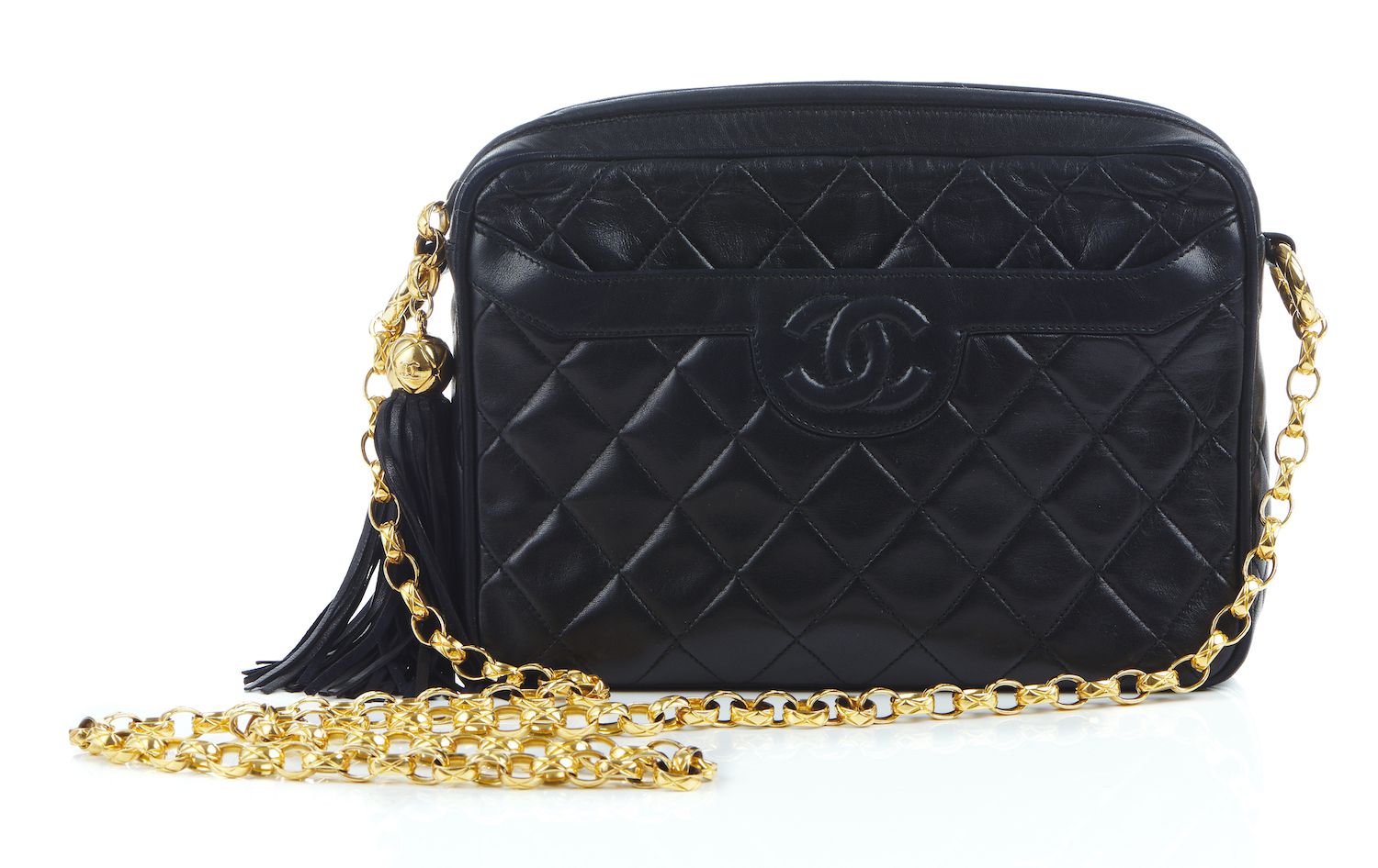 Styled in quilted black leather with gold metal hardware and fancy link chain shoulder strap, 22 x 16 x 6cm, boxed.