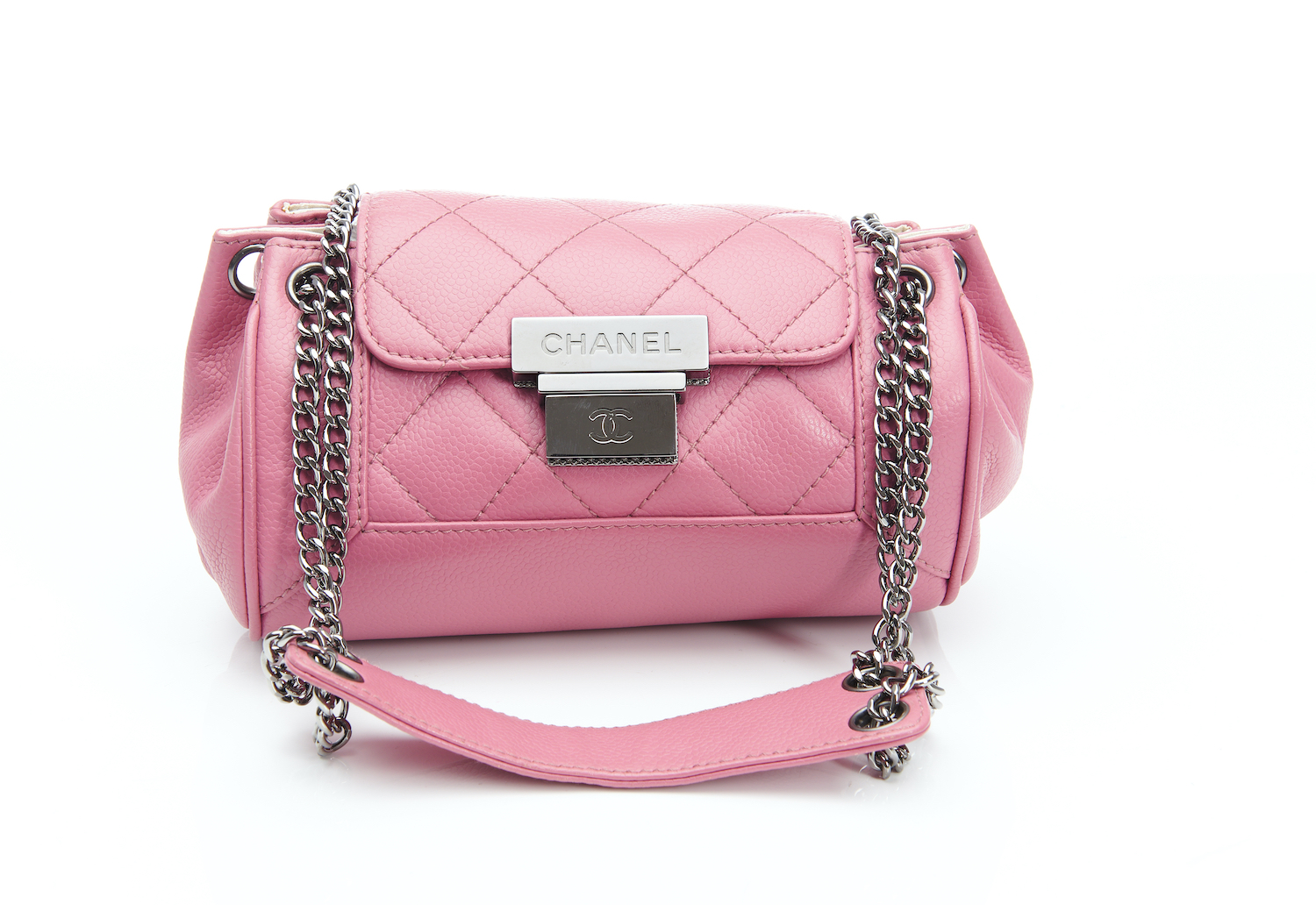 Styled in pink leather with signed silver metal clasp and oxidised chain and leather strap, 13 x 18 x 3cm.