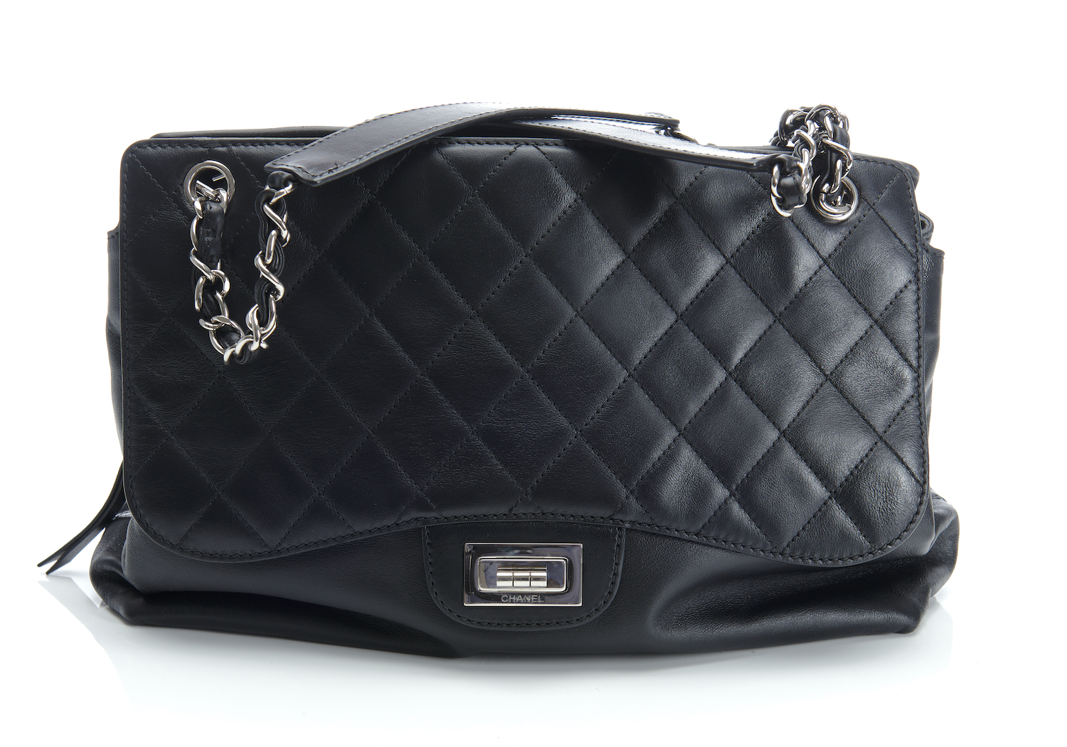 Styled in quilted black leather with silver metal hardware and conforming woven chain and leather shoulder strap, 32 x 25 x 12cm.