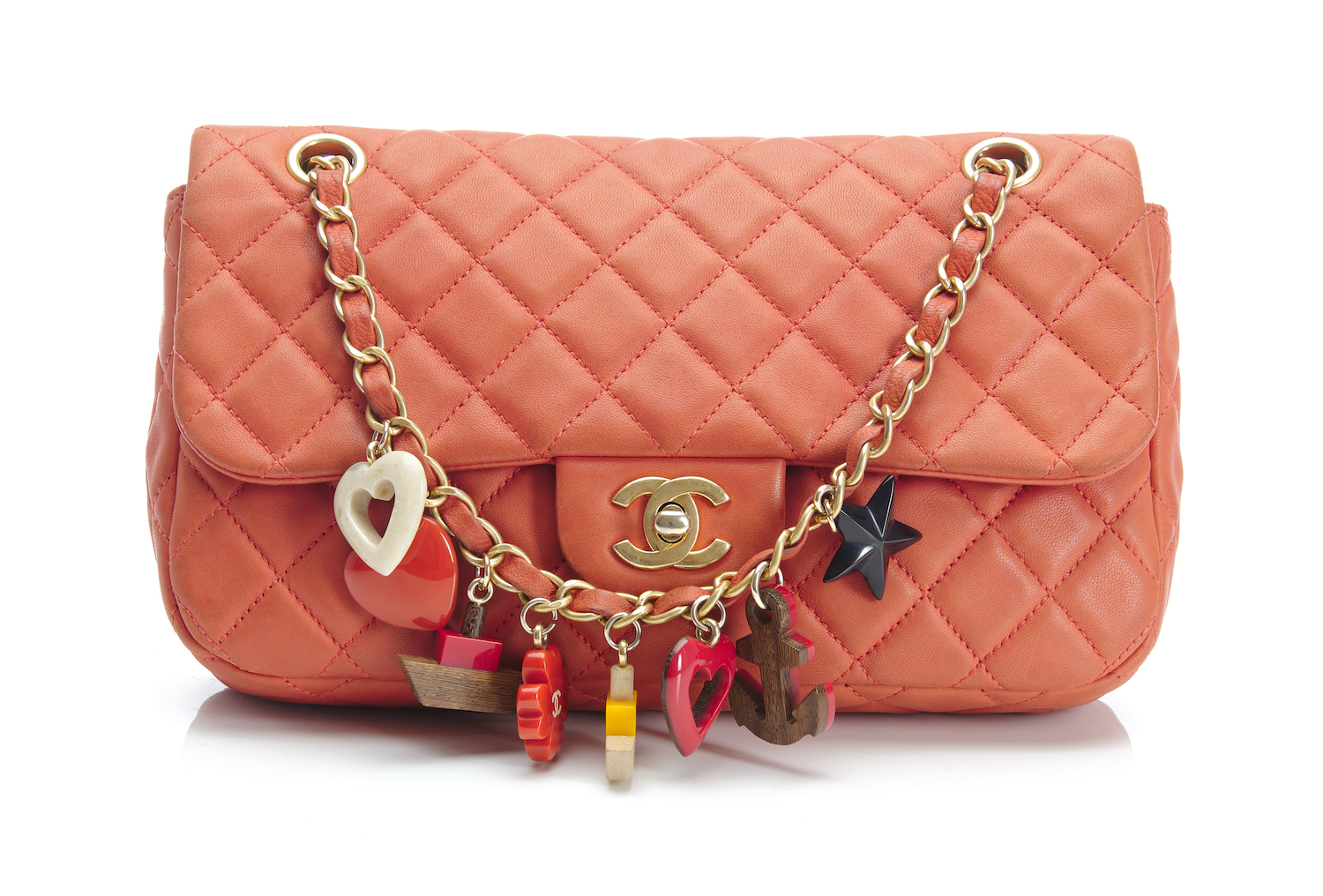 Styled in tangerine quilted leather with gold metal hardware and conforming woven chain and leather shoulder strap, with assorted charms, 24 x 16 x 6cm, boxed.