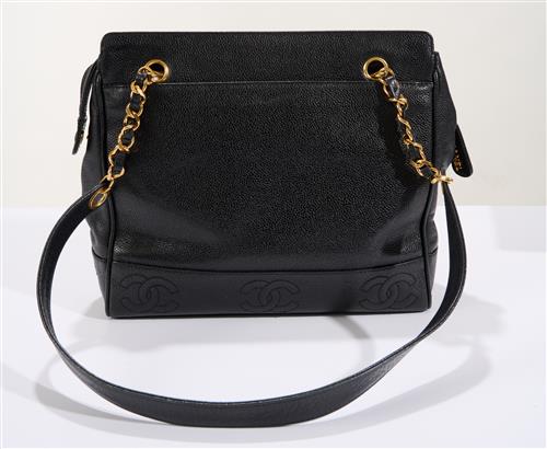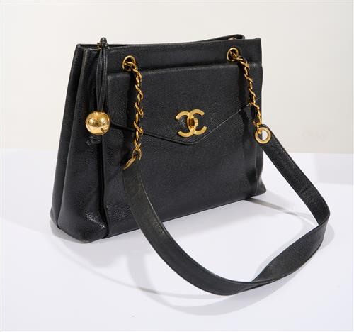 Styled in black caviar leather, interlaced chain shoulder strap, large charm and gold tone metal hardware, 29 x 24 x 8cm.