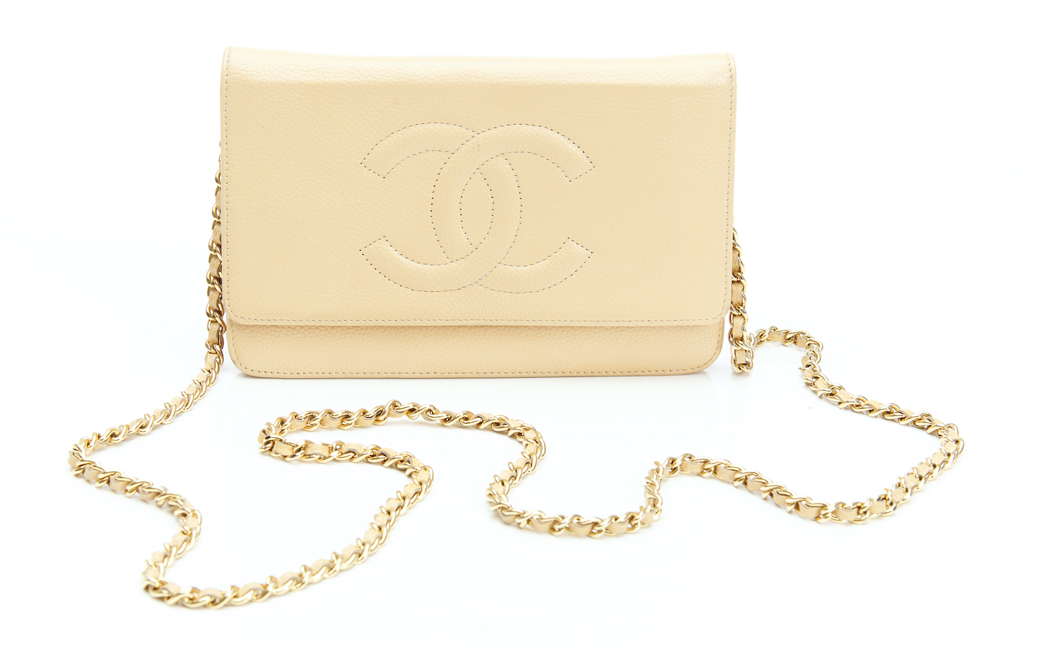 Styled in beige caviar leather with gold metal hardware and conforming woven chain leather shoulder strap, 19 x 12cm.