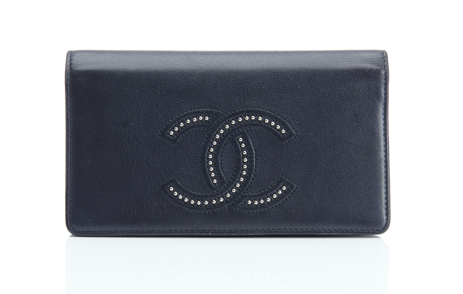 Styled in black leather with silver metal hardware and embellished monogram, 18 x 10 x 2cm, boxed.
