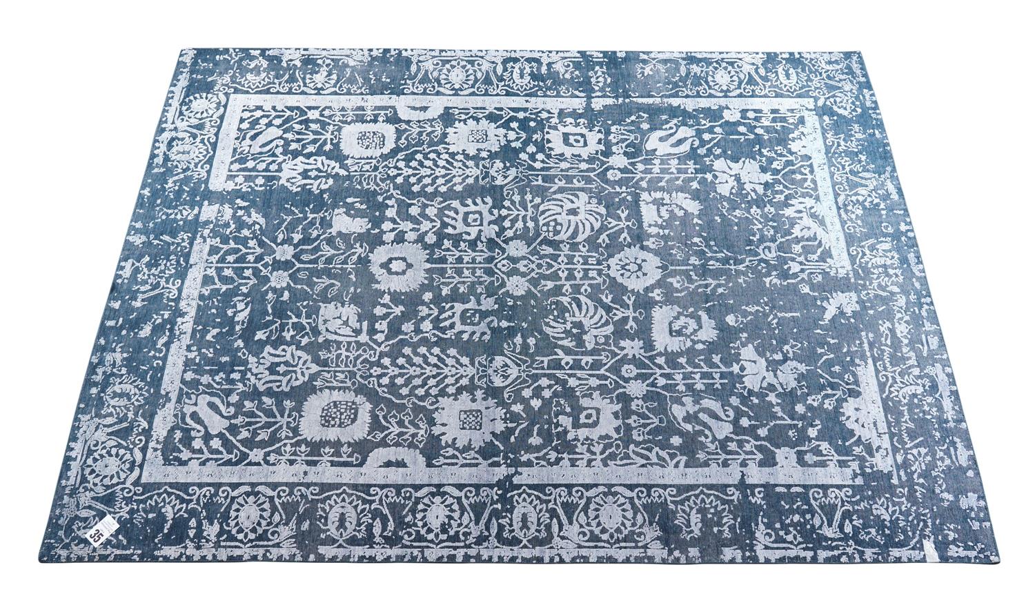 A MODERN TRANSITIONAL ERASED OXIDIZED CARPET, WOOL & VISCOSE SILK TEXTURE. CONTEMPORARY TRANSITIONAL DESIGN OF ERASED EMBOSSED PALMETTES AND "TREE OF LIFE" PATTERNS AND BORDER IN A GREY FIELD. NEW & IN EXCELLENT CONDITION. 366 X 270 CM, ORIGIN INDIA