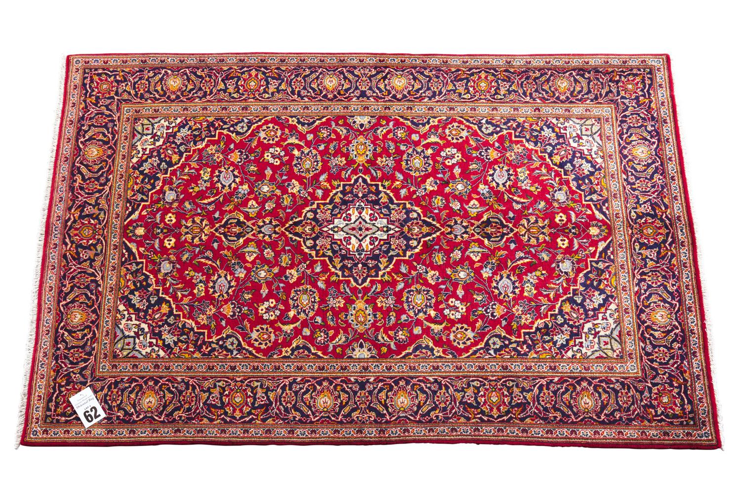 A FINE TRADITIONAL PERSIAN KASHAN CARPET, 100% KORK (LAMB'S) WOOL PILE. FINELY HAND-KNOTTED KASHAN WEAVE OF 500,000 KNOTS PER SQUARE METER. TRADITIONAL BOOK COVER DESIGN OF BOLD CHANDELIER MEDALLION AND QUARTERED CORNER MEDALLIONS IN A CRIMSON FIELD OF 16TH CENTURY SHAH ABBASSI PALMETTES, FLORAL SPRAYS AND SAZ LEAVES. BORDER OF PALMETTES, FLORAL MOTIFS AND SAZ LEAVES. EX-GALLERY STOCK. IN PRISTINE CONDITION. 218 X 146 CM, ORIGIN IRAN