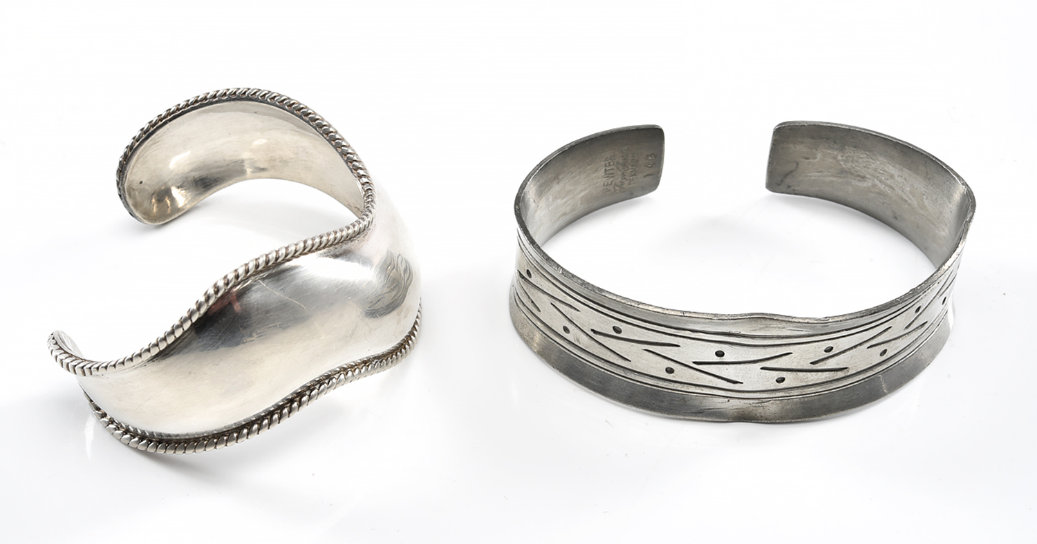 A CUFF BANGLE BY JURGEN JENSEN IN PEWTER, TOGETHER WITH A CUFF BANGLE IN SILVER