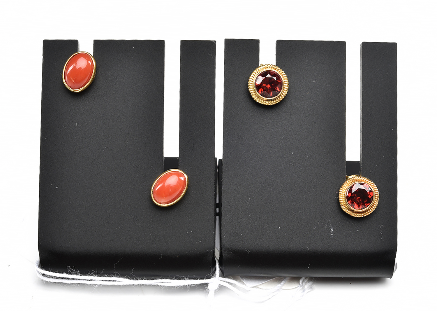 A PAIR OF ANTIQUE STYLE GARNET STUD EARRINGS IN SILVER GILT, TOGETHER WITH A PAIR OF CORAL STUD EARRINGS IN 9CT GOLD.