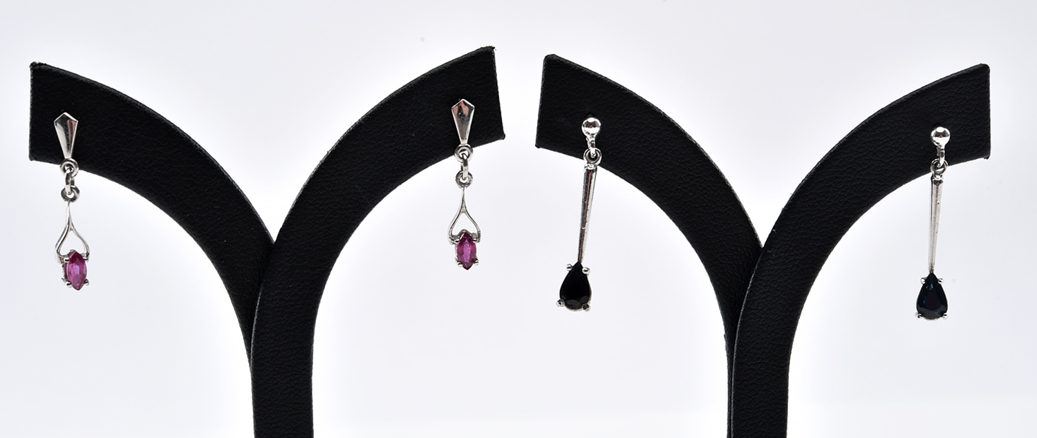 A PAIR OF SAPPHIRE DROP EARRINGS IN STERLING SILVER, TOGETHER WITH A PAIR OF RUBY DROP EARRINGS IN 9CT WHITE GOLD
