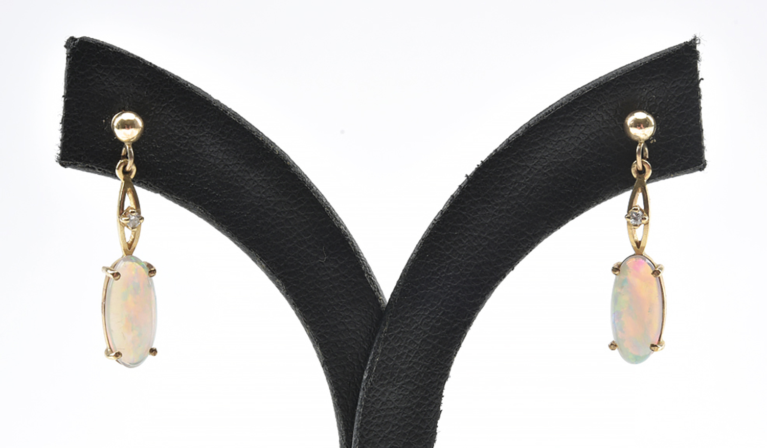A PAIR OF VINTAGE SOLID WHITE OPAL AND DIAMOND DROP EARRINGS IN 9CT GOLD, TOTAL LENGTH 20MM, 1.4GMS