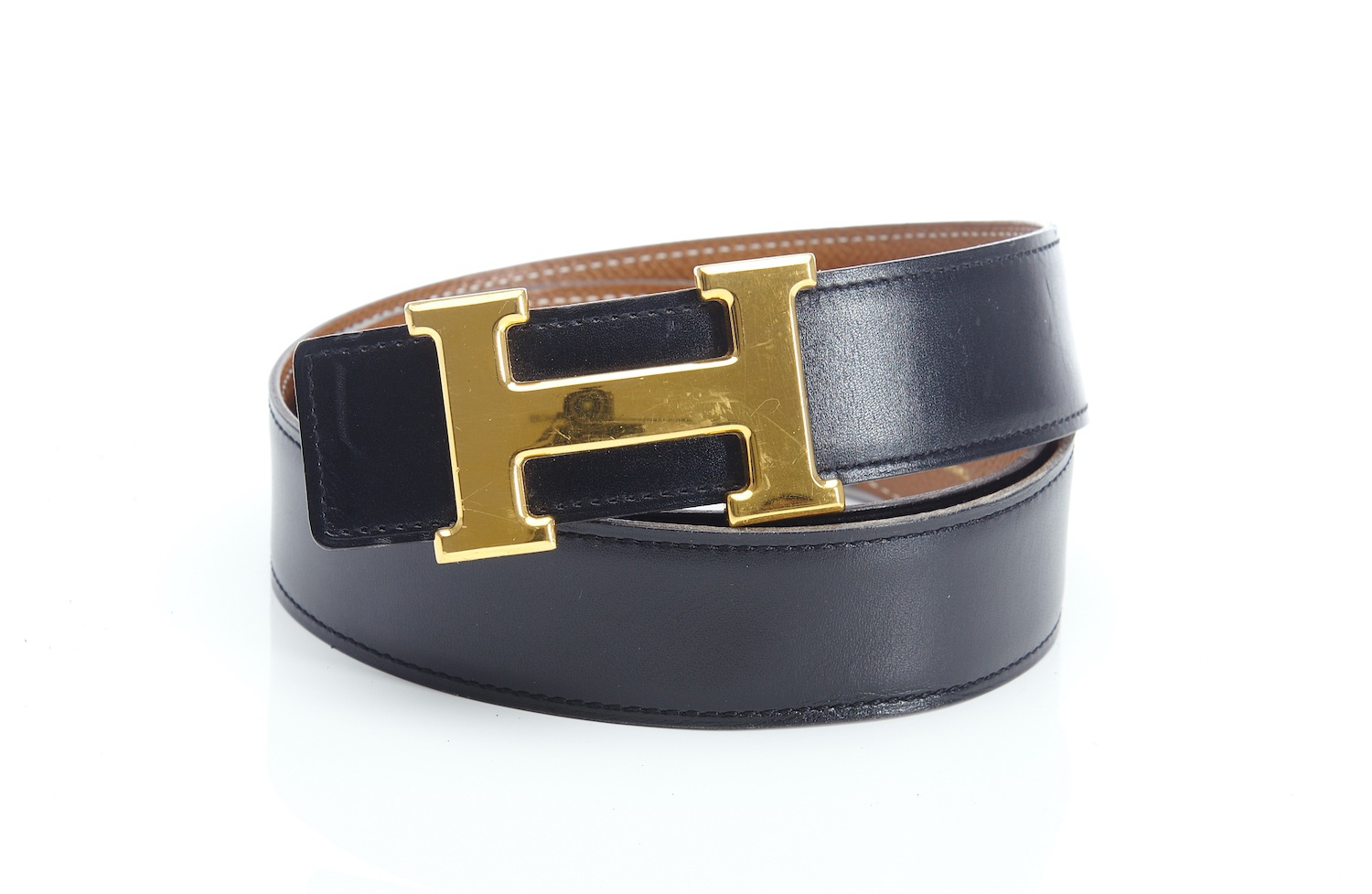 Styled in black leather with tan reverse, to a gold metal 'H' buckle, labelled size 85.
