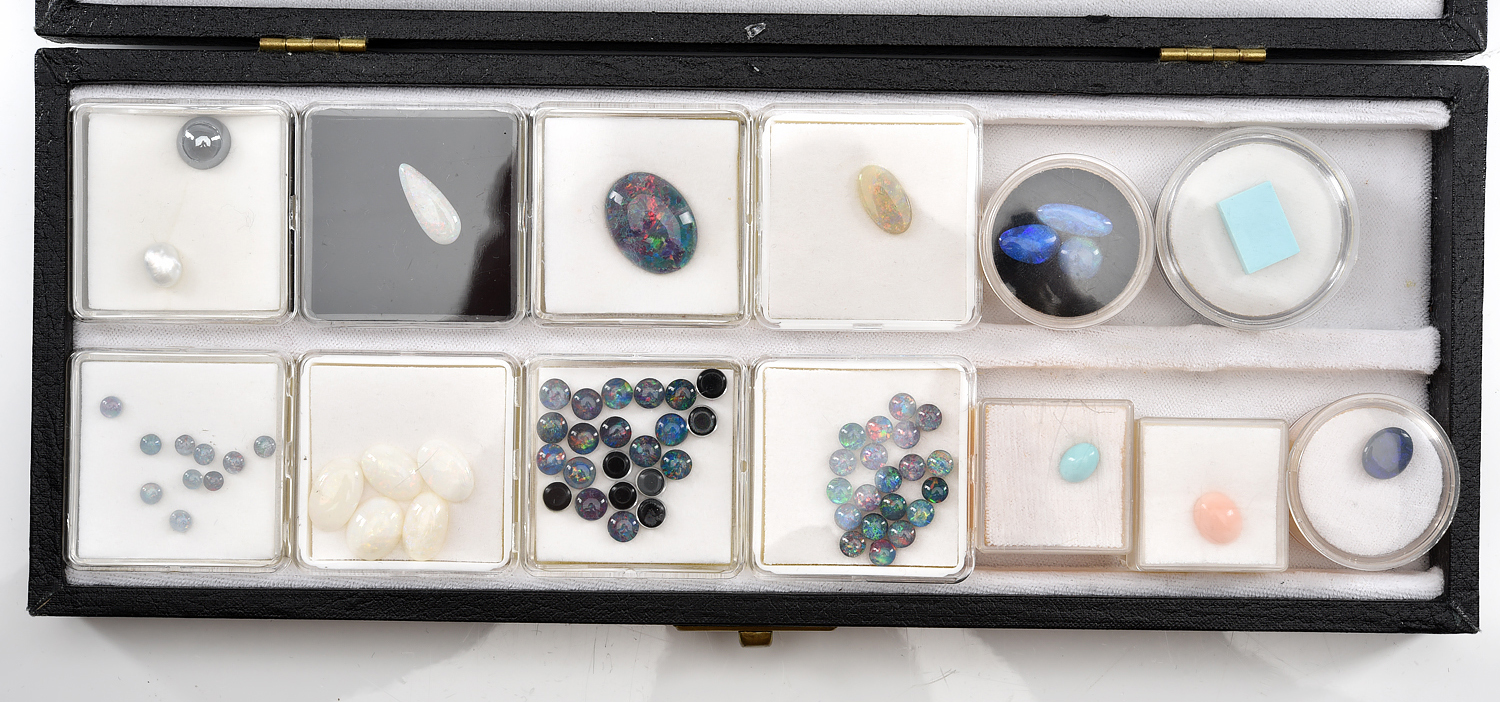 A BOX OF ASSORTED LOOSE GEMSTONES, INCLUDING SOLID OPALS, OPAL TRIPLETS, TURQUOISE, CORAL, PEARL ETC
