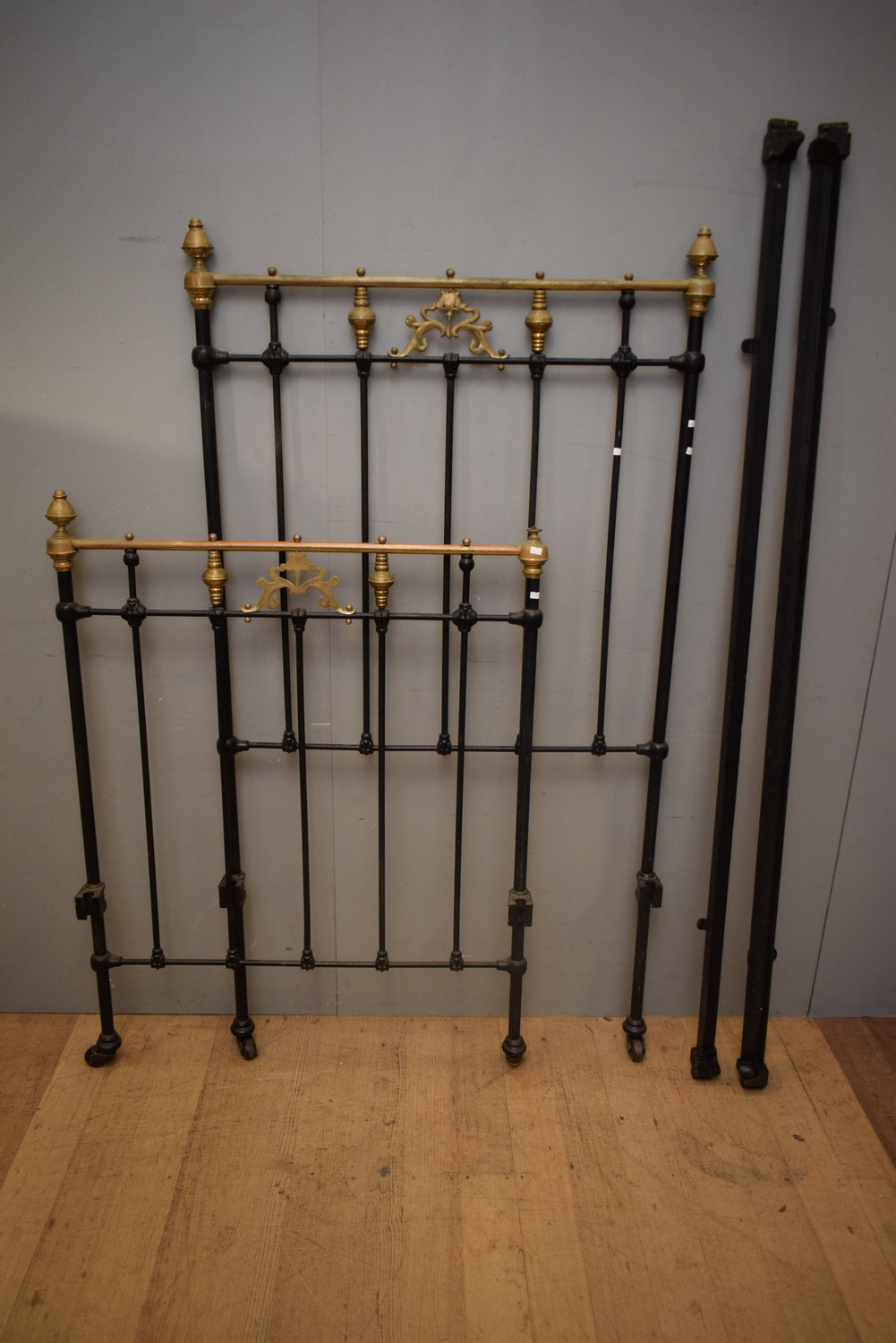 AN ART NOUVEAU BRASS AND WROUGHT IRON SINGLE BED WITH RAILS (A/F) (BEDHEAD 170H X 93W CM)
