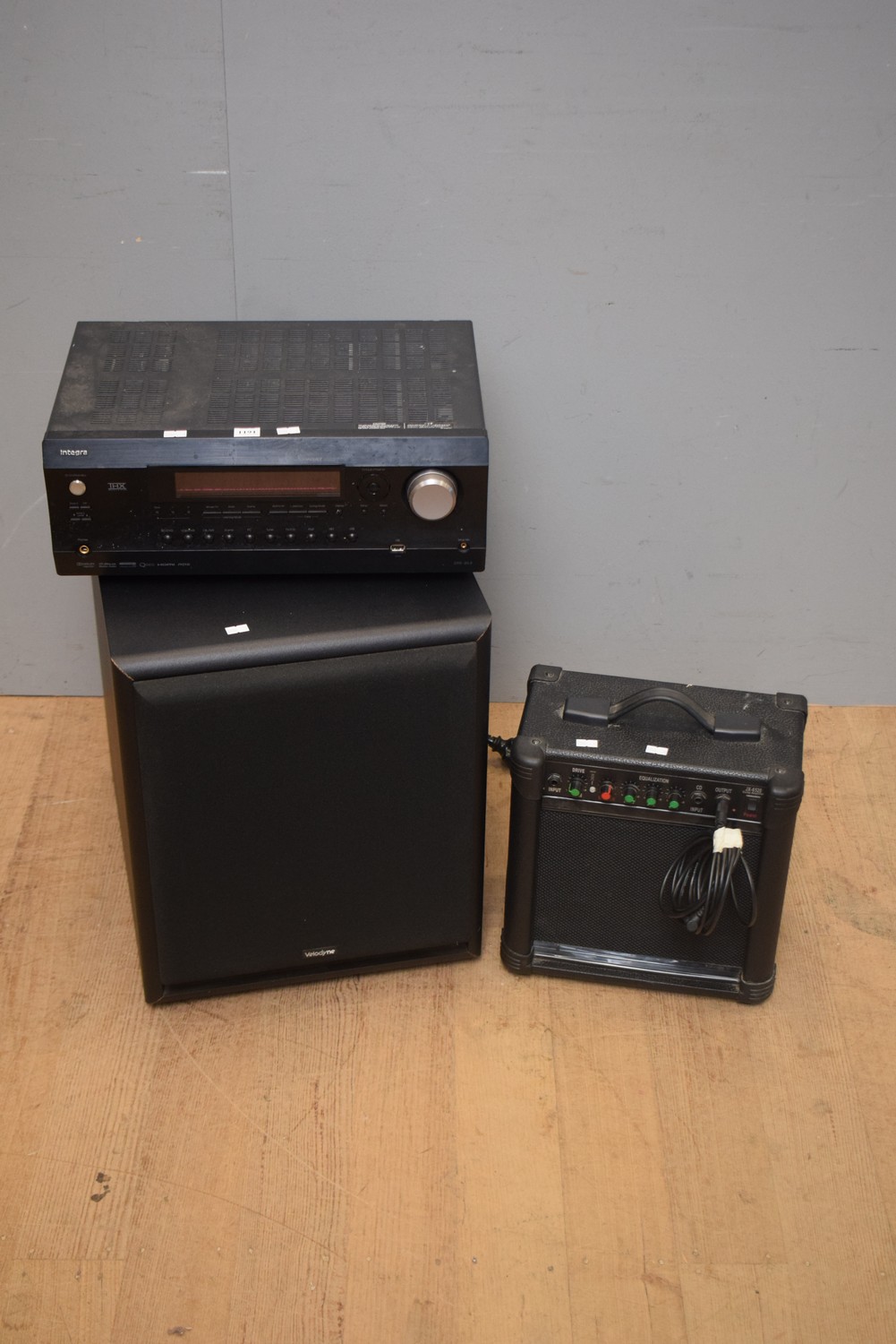 A COLLECTION OF SOUND EQUIPMENT INCLUDING SUBWOOFER, AMPLIFIER AND SPEAKER (UNTESTED)