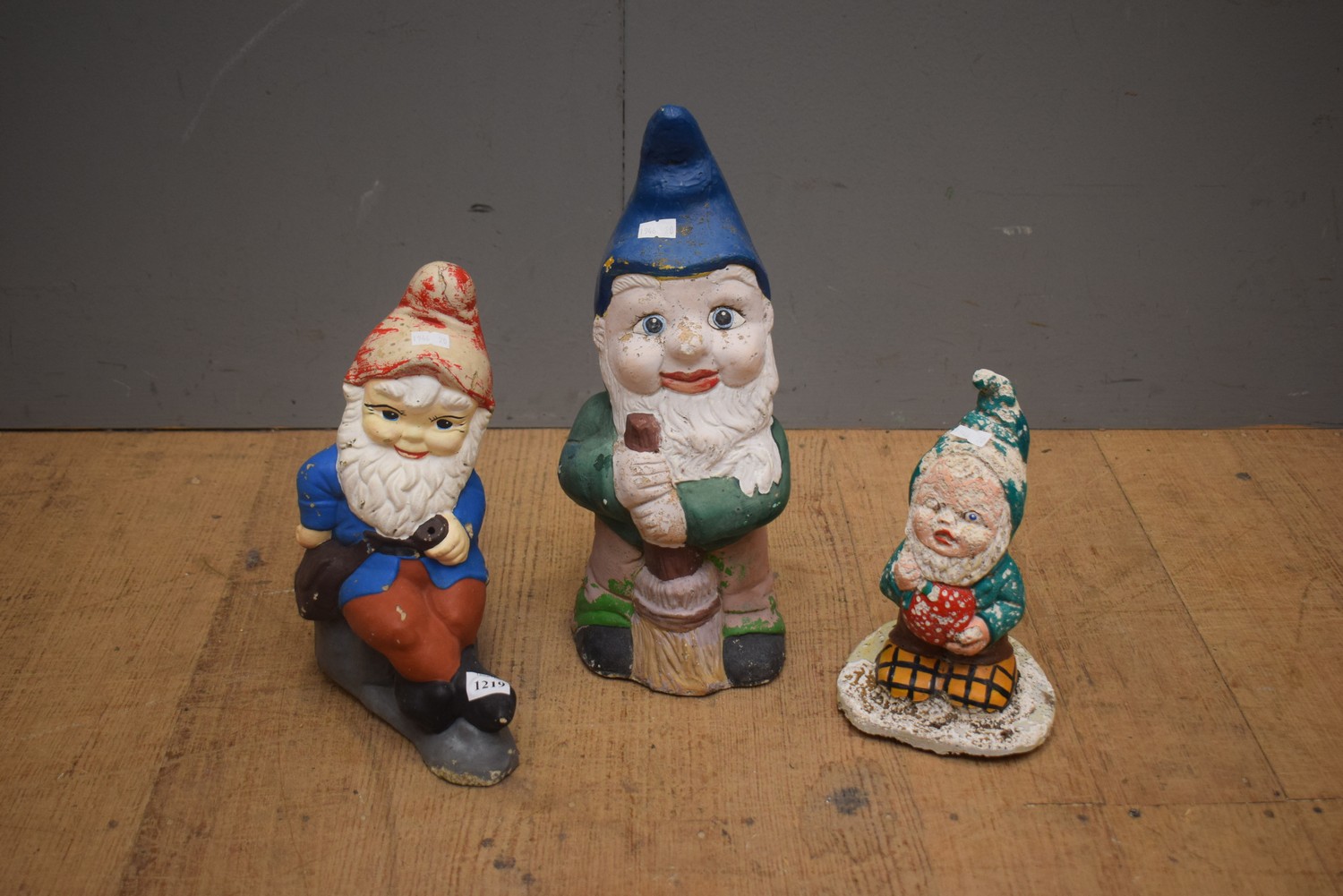 A COLLECTION OF THREE GARDEN GNOMES (LARGEST 35 CM H)