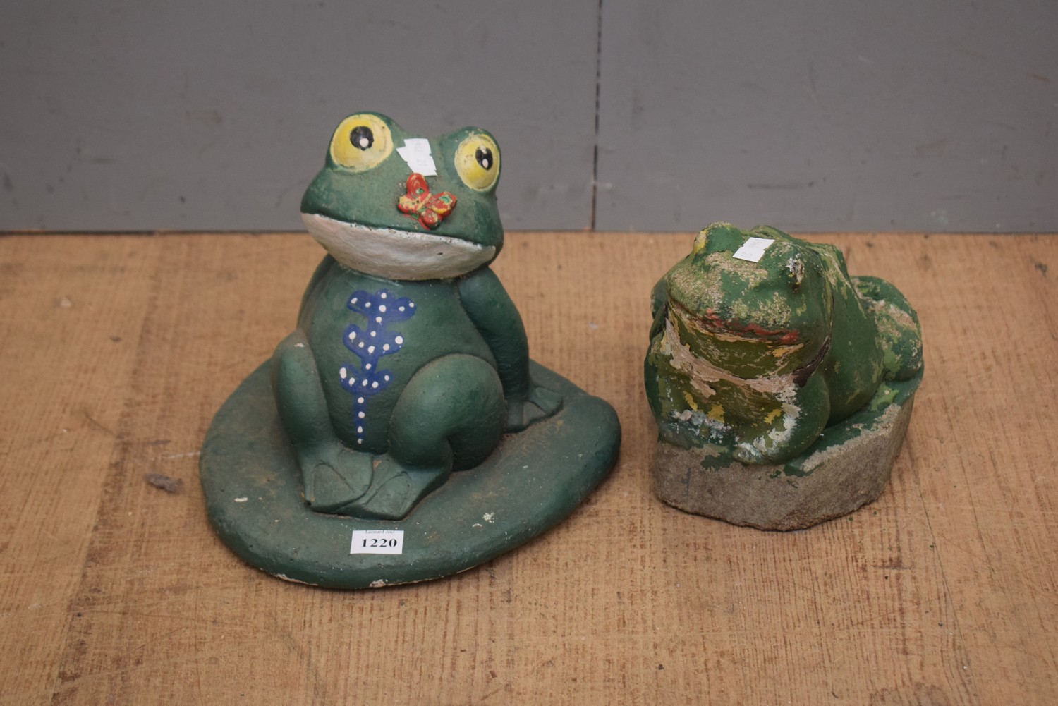 TWO CONCRETE GARDEN FROGS (A/F) (THE LARGER 20 CM H)
