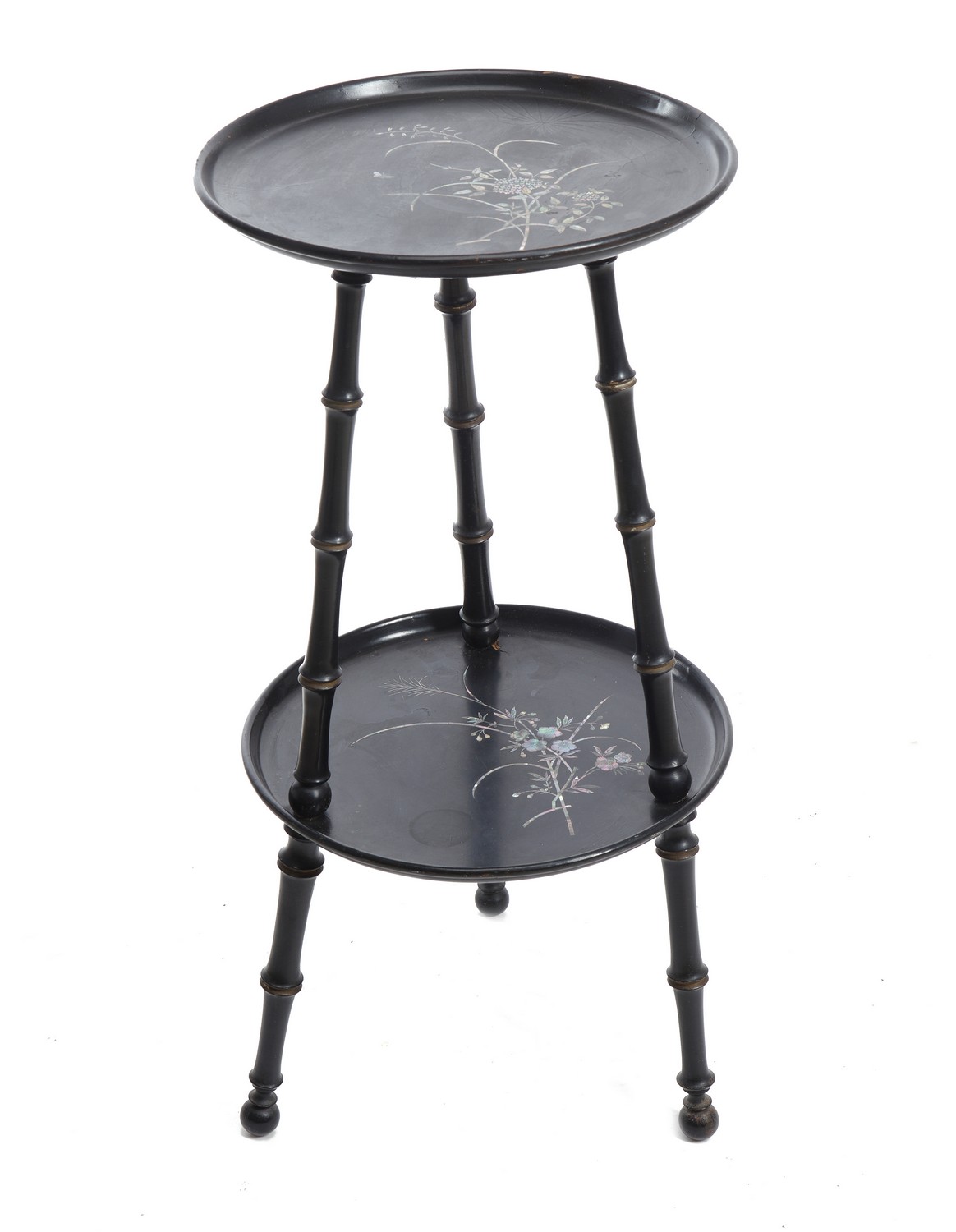 The table with two circular tiers, each inset with mother of pearl decoration, joined by three faux bamboo legs (A/F)