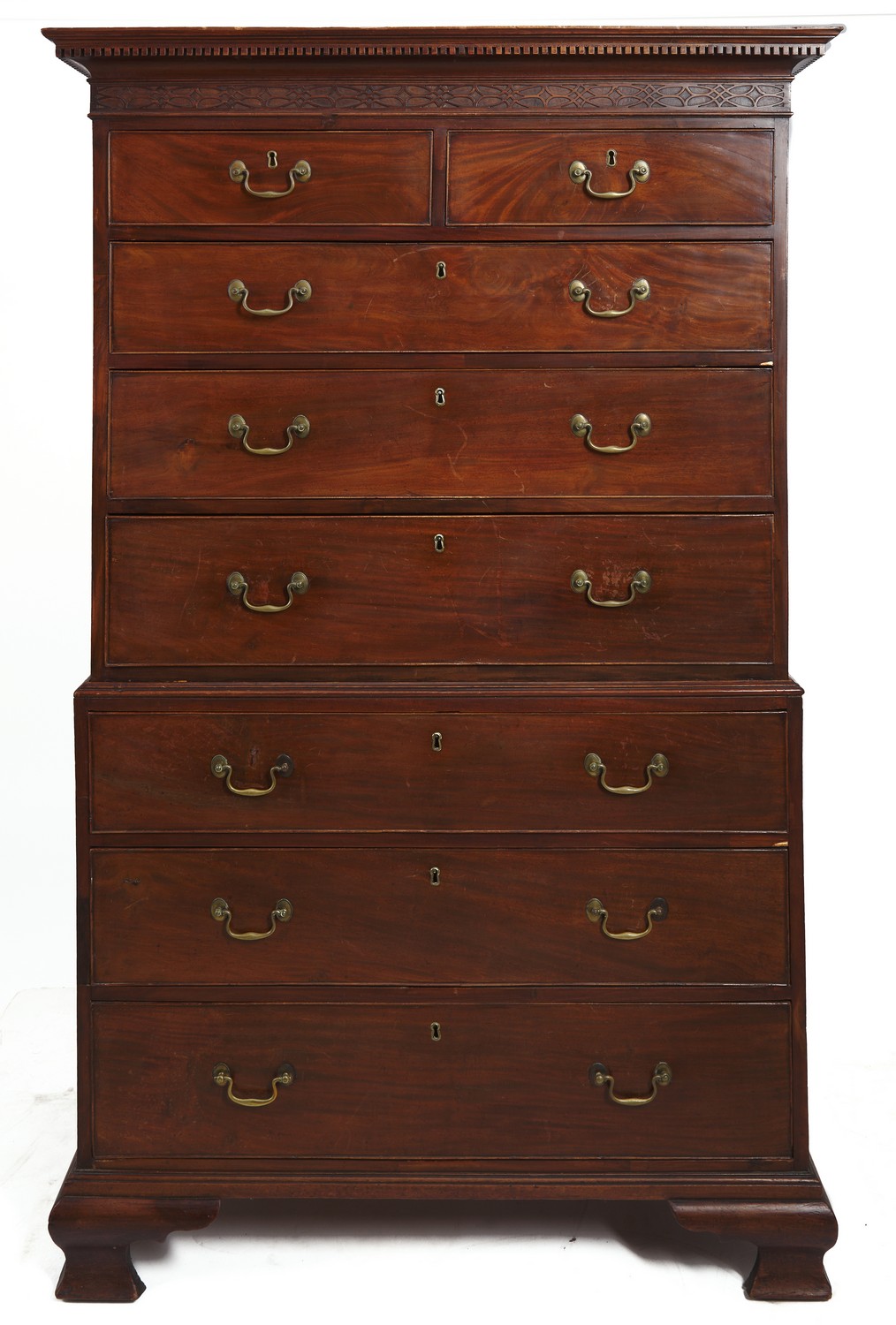 The upper body with fretwork freize above two small and three large drawers, the lower body with three large drawers above bracket feet.