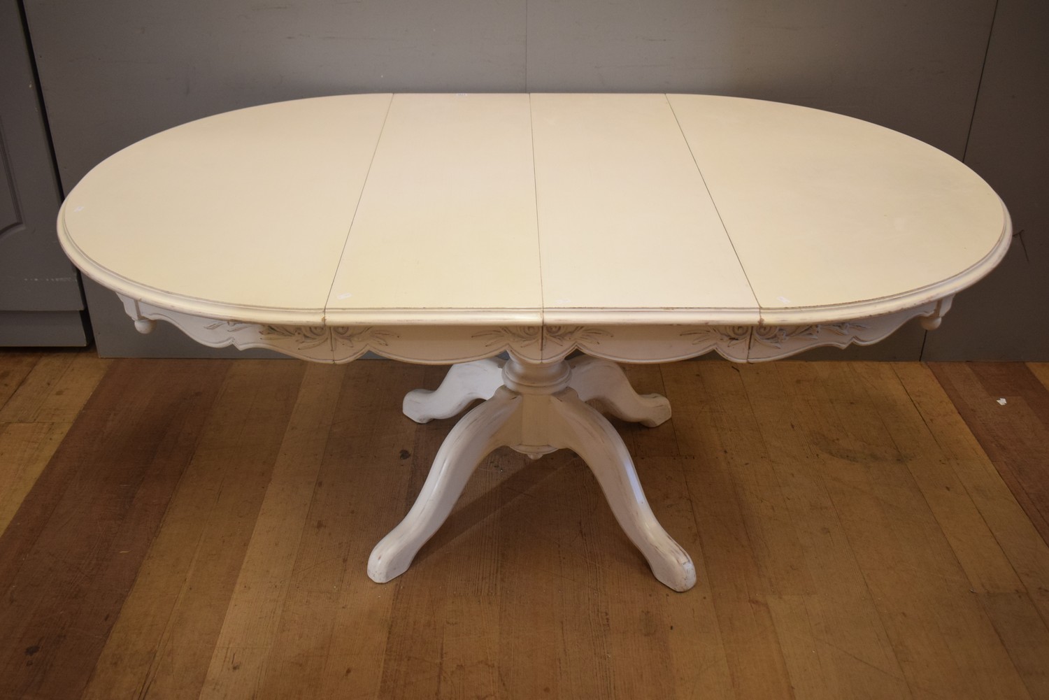 A FRENCH PROVINCIAL STYLE EXTENSION DINING TABLE WITH TWO LEAVES (76H X 180W EXTENDED X 115W CM)