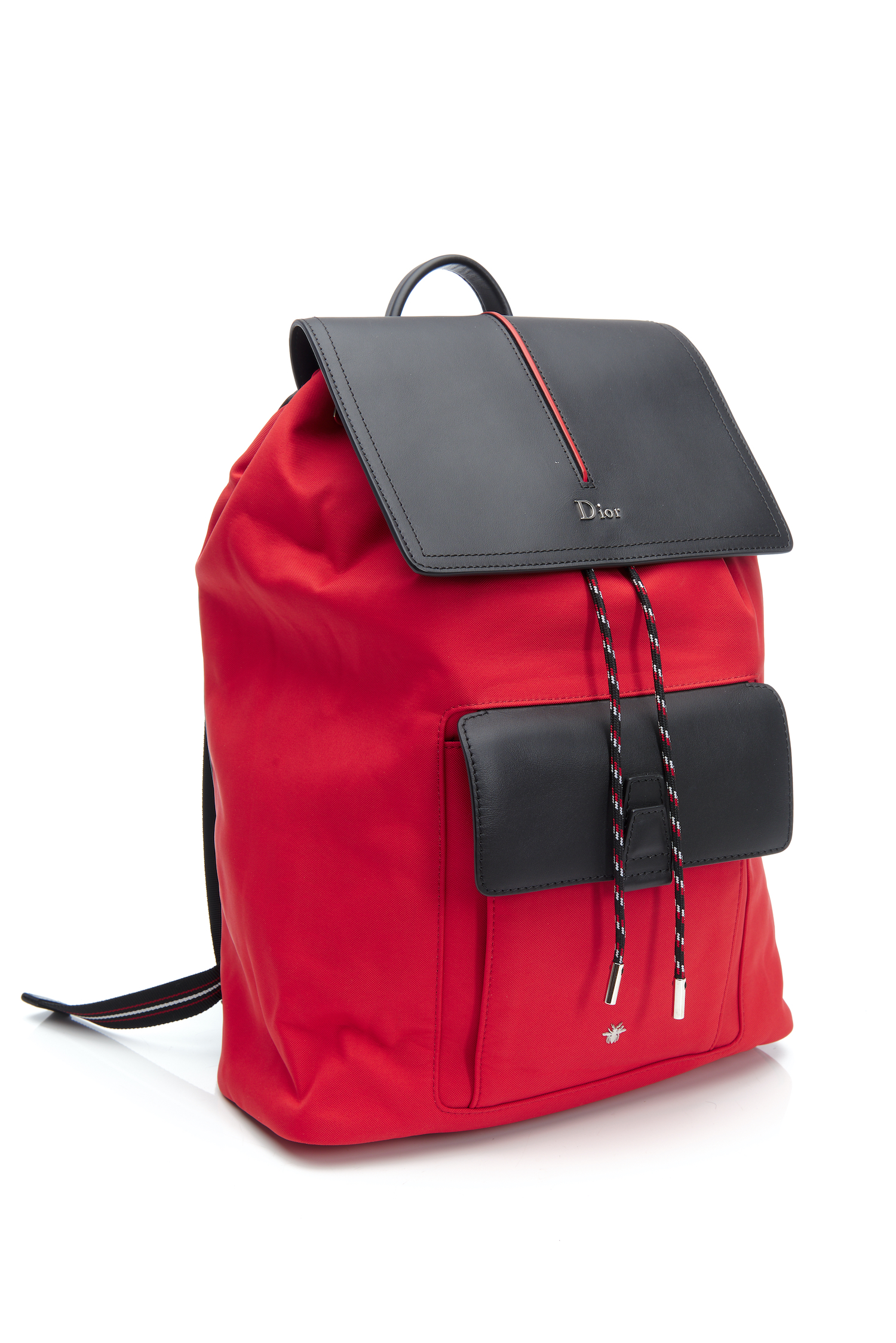 Styled in red canvas with black leather trim and silver metal hardware, 30 x 40 x 12cm.