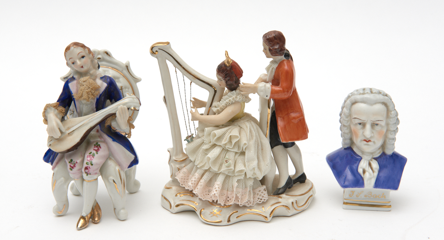 TWO DRESDEN PORCELAIN PARLOUR SCENES TOGETHER WITH A BUST OF BACH