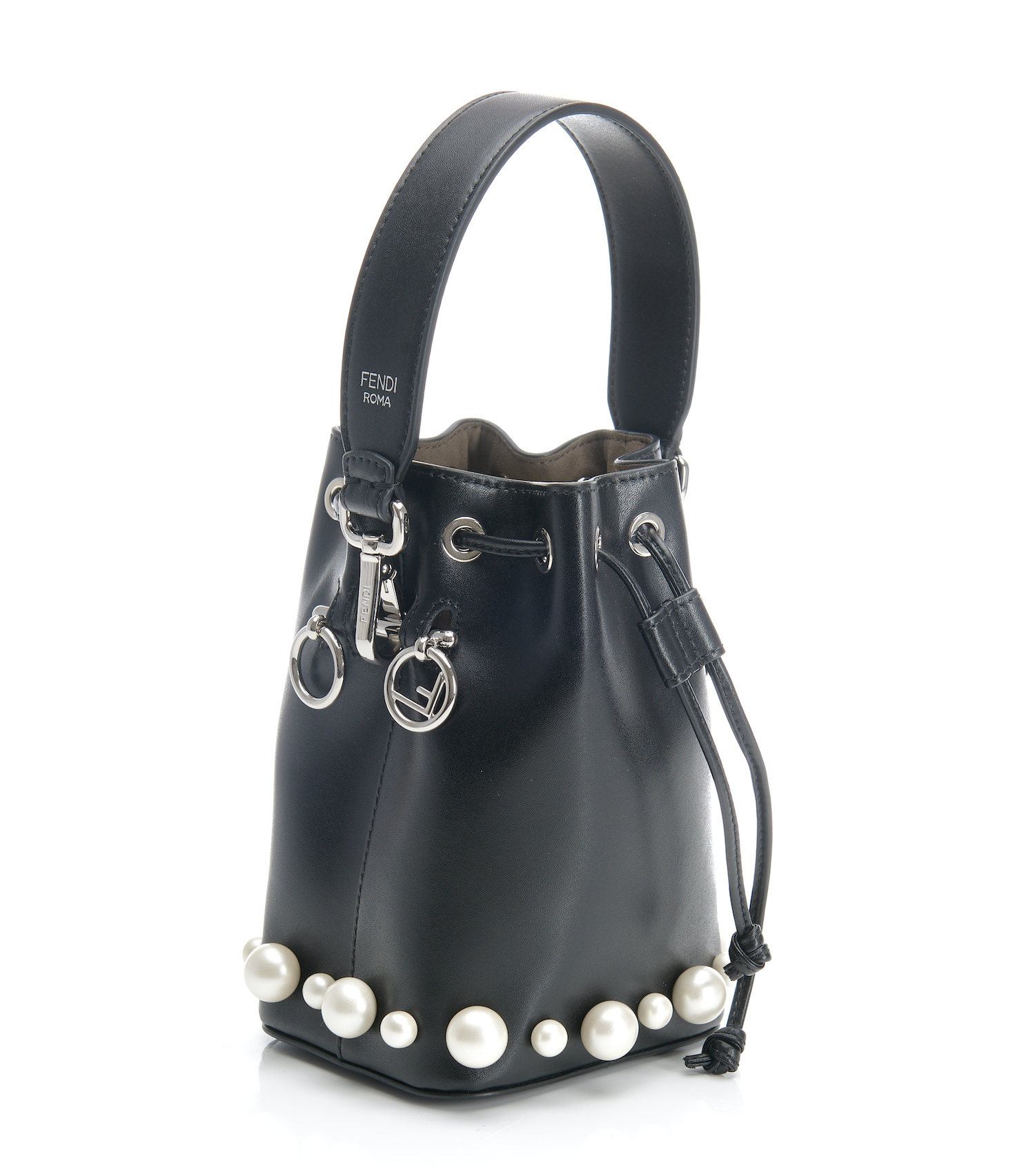 Styled in black leather with faux pearl detail and silver metal hardware, 13 x18 x 10cm.