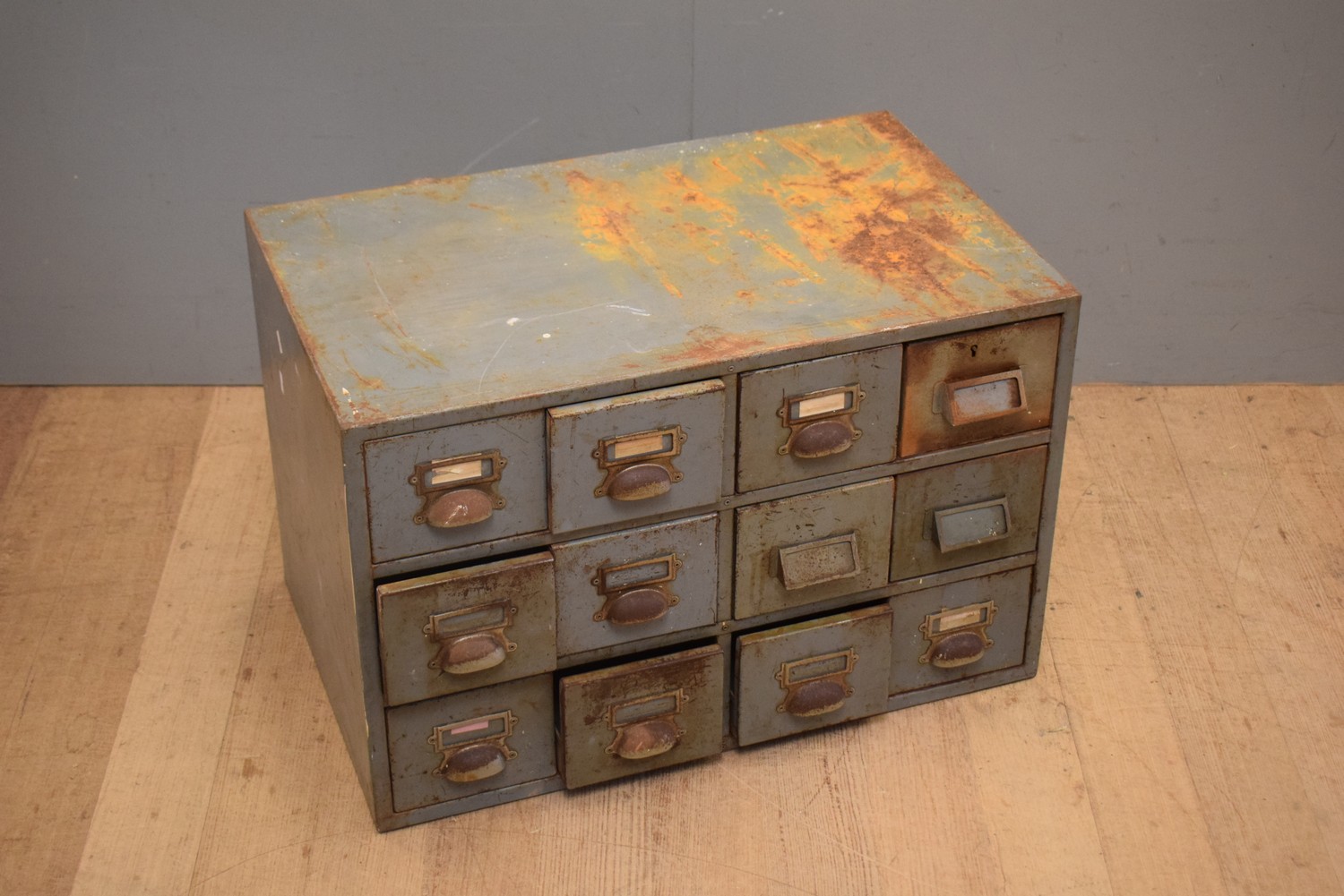 A TWELVE DRAWER INDUSTRIAL SET OF DRAWERS (A/F) (45H X 70W X 43D CM)