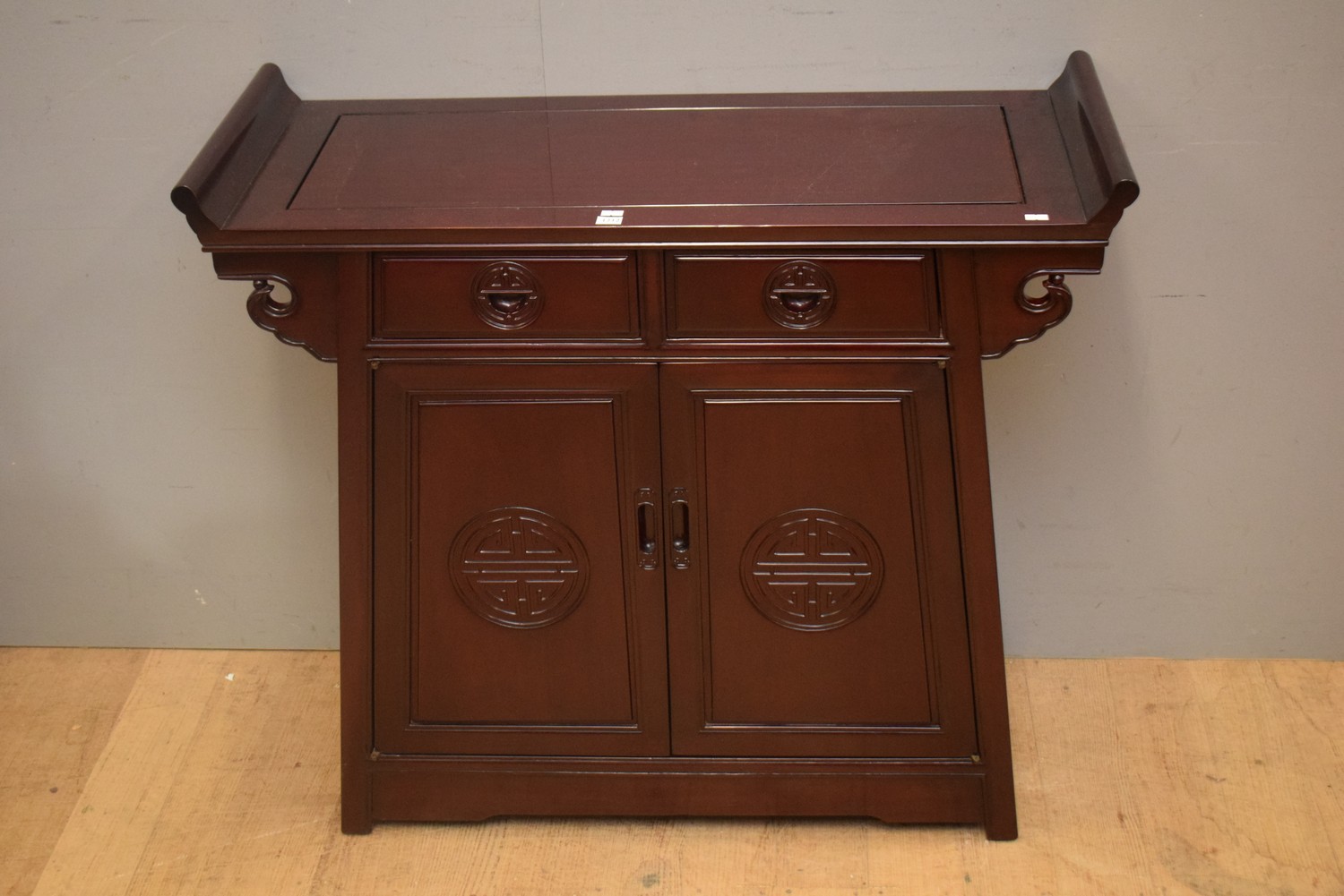 A CHINESE TWO DOOR ALTAR CONSOLE (84H X 96W X 39D CM)