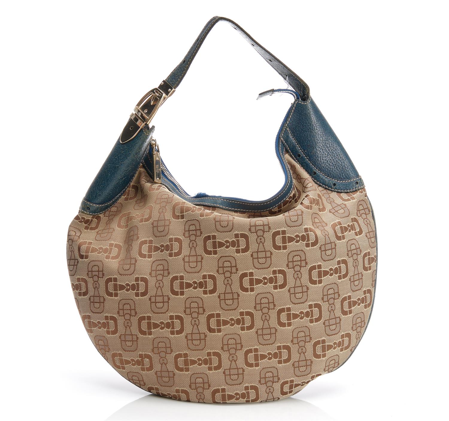 Styled in beige horse-bit design canvas with blue leather trim and gold metal hardware, 36 x 29cm.