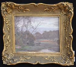 WILLIAM ROWELL, A LOVELY SPOT, OIL ON BOARD, 19 X 24CM, FRAME SIZE: 33 X 39CM, CONDITION: OVERALL GOOD WITH HAIRLINE CRACKS, IN ORIGINAL JOHN THALLON FRAME (LABEL VERSO)