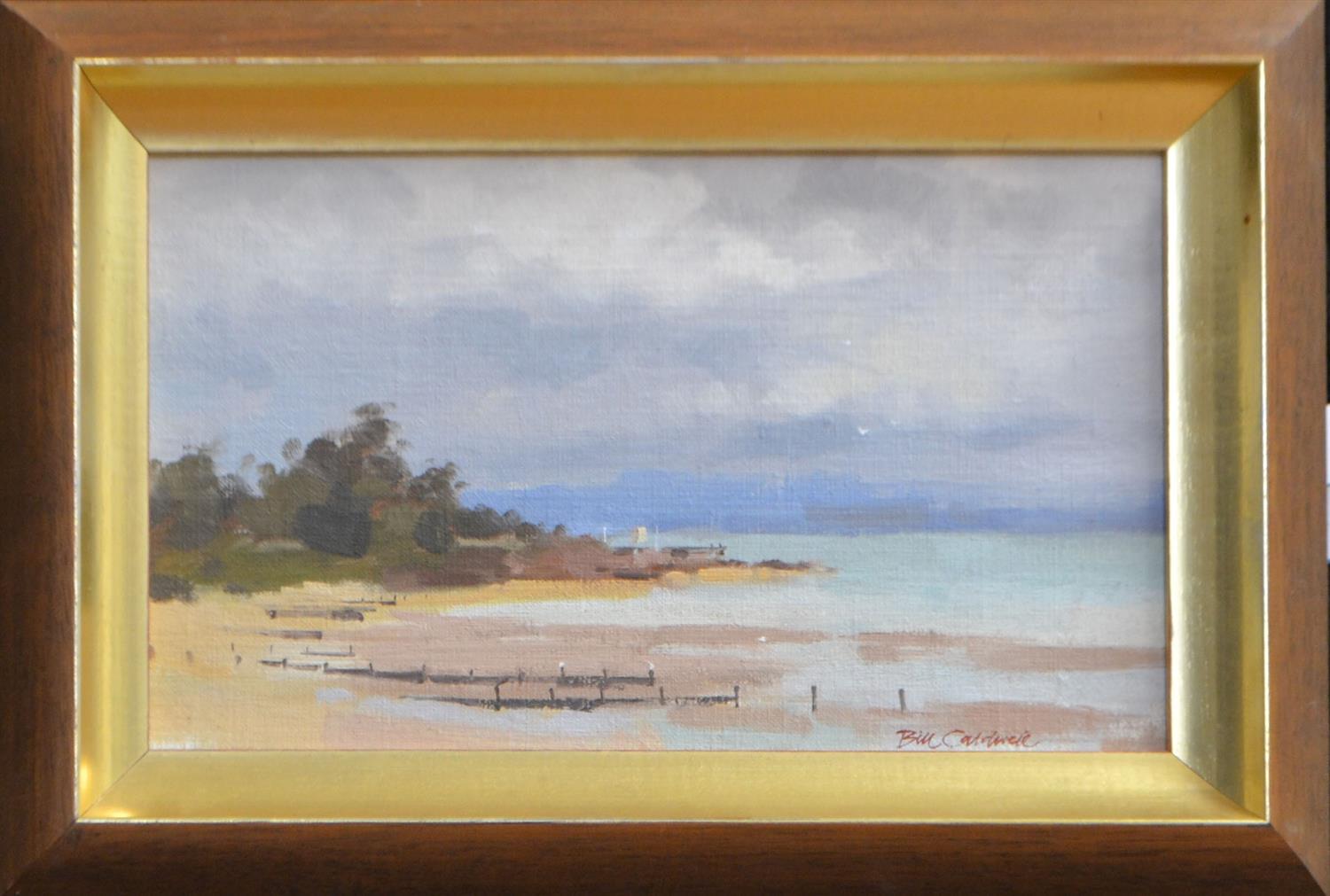 BILL CALDWELL, BEACH SCENE, OIL ON BOARD, 19 X 31CM, FRAME SIZE: 28 X 42CM, CONDITION: VERY GOOD