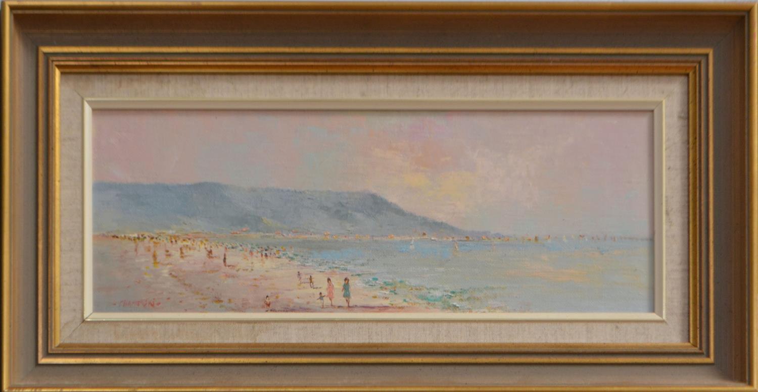 RICHARD CHAMERSKI, BEACH, OIL ON BOARD, 15 X 40CM, FRAME SIZE: 28.5 X 53.5CM, CONDITION: VERY GOOD